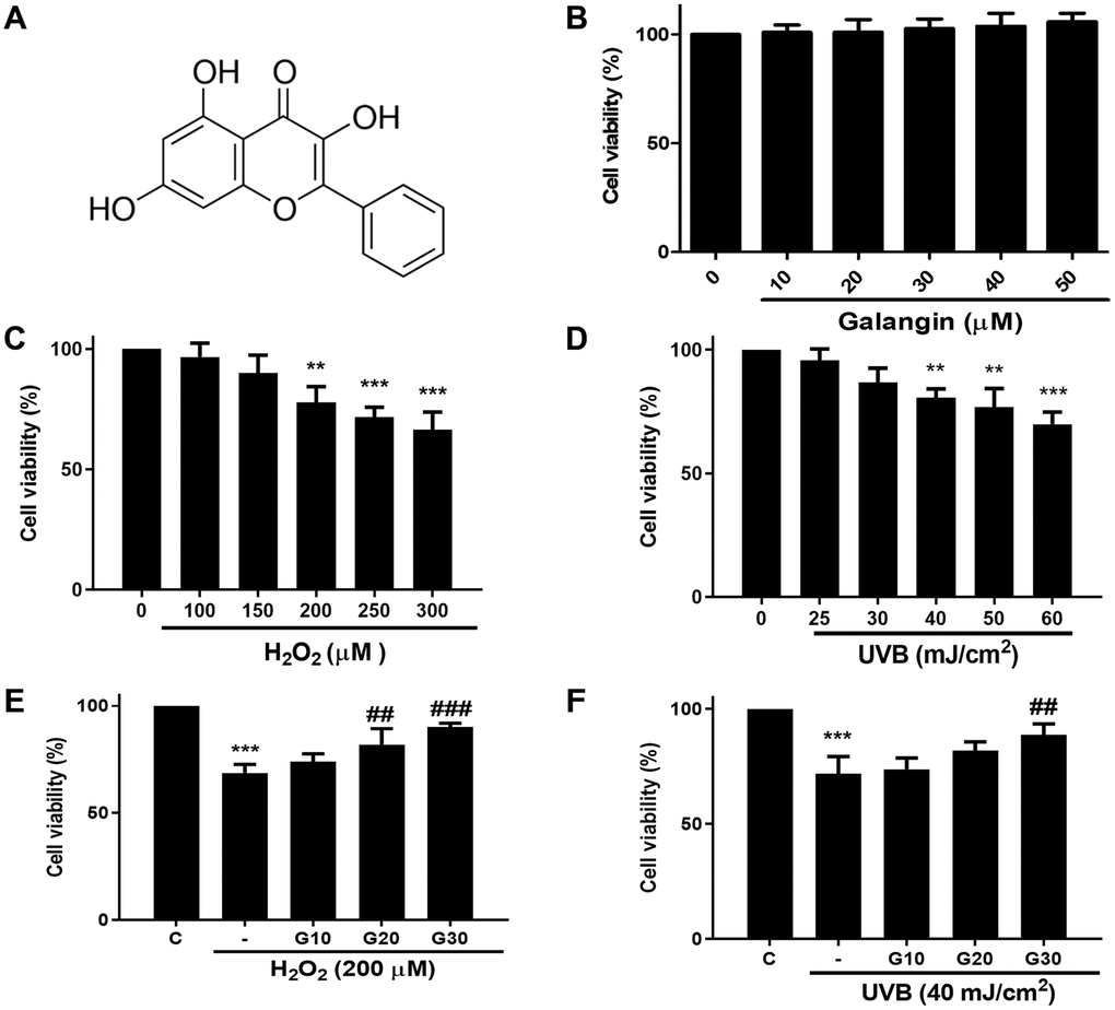 To investigate the cytotoxicity of galangin (Figure 1A) in vitro, HS68 cells were treated with different dosses of galangin (0, 10, 20, 30, 40, 50 μM) for 24 h. MTT assay results showed that galangin was not cytotoxic to HS68 cells (Figure 1B). Next, we exposed HS68 cells to different doses of H2O2 (0, 100, 150, 200, 250, 300 μM) and UVB (0, 25, 30, 40, 50, 60 mJ/cm²) for 24 h. H2O2 and UVB treatment decreased the cell viability in a dose-dependent manner (Figure 1C, 1D). To evaluate the cytoprotective properties of galangin following H2O2 and UVB exposure, we treated HS68 cell with different concentration of galangin (10, 20, 30 μM) following H2O2- (200 μM) and UVB-induced (40 mJ/cm²) damage. H2O2 or UVB treatment alone significantly decreased (40%) the viability of HS68 cells. However, galangin treatment prevented cell death in a concentration-dependent manner (Figure 1E, 1F). Higher concentration of galangin (30 μM) prominently alleviated H2O2- and UVB-induced cytotoxicity. Therefore, the dose of 30 μM galangin was used in subsequent in vitro studies to evaluate its protective effects in HS68 cells.