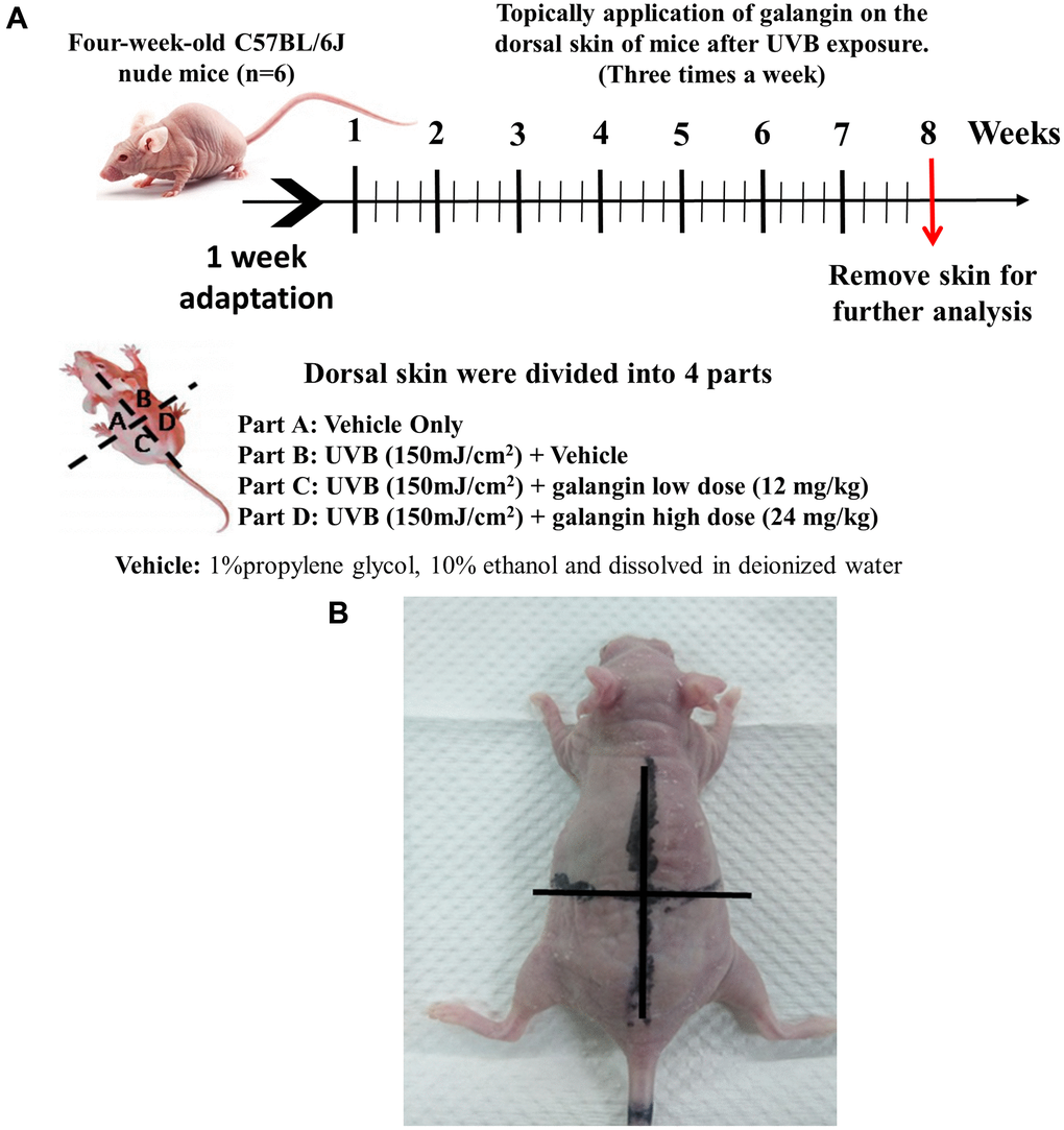 Four-weeks-old C57BL/6J nude mice were obtained from BioLasco Taiwan Co., Ltd, Taipei, Taiwan. In accordance with the National Laboratory Animal Center (NLAC) protocols, animals were housed at China Medical University Animal Center under controlled temperature conditions (22–24°C) and 12-h light-dark cycle with free access to standard laboratory diet and tap water during the experimental period. The dorsal skin regions of mice were marked with India ink and the animals were divided into four groups (n = 6/group): control plus vehicle group, UVB-irradiated plus vehicle group, UVB-irradiated plus low-dose (12 mg/kg) galangin-treated group, and UVB-irradiated plus high-dose (24 mg/kg) galangin-treated group. The allocated skin areas were irradiated with 150 mJ/cm2 UVB per exposure and topically treated with vehicle or galangin three times a week for 8 weeks. After weighing mouse body weight, galangin was freshly prepared at a concentration of 12 mg/kg and 24 mg/kg in propylene glycol/ethanol/H2O (1:1:8). Solution (100uL) was topically applied to the designated sites (2 × 2 cm) on dorsal skin of mice. For UVB exposure, mice were placed in a UV crosslinker box which was equipped with UVB bulbs. Before mice received UVB irradiation, control (non UVB-exposed area) was covered with anti-UV sticker. Different doses of galangin or vehicle were topically applied on the dorsal skin of mice after UVB exposure. At the end of the experiment all animals were weighed and sacrificed. Then, their dorsal skin was quickly excised, immediately frozen in liquid nitrogen, and stored at −80°C for protein and RNA analyses; a part was fixed with 10% formalin solution for histological staining.