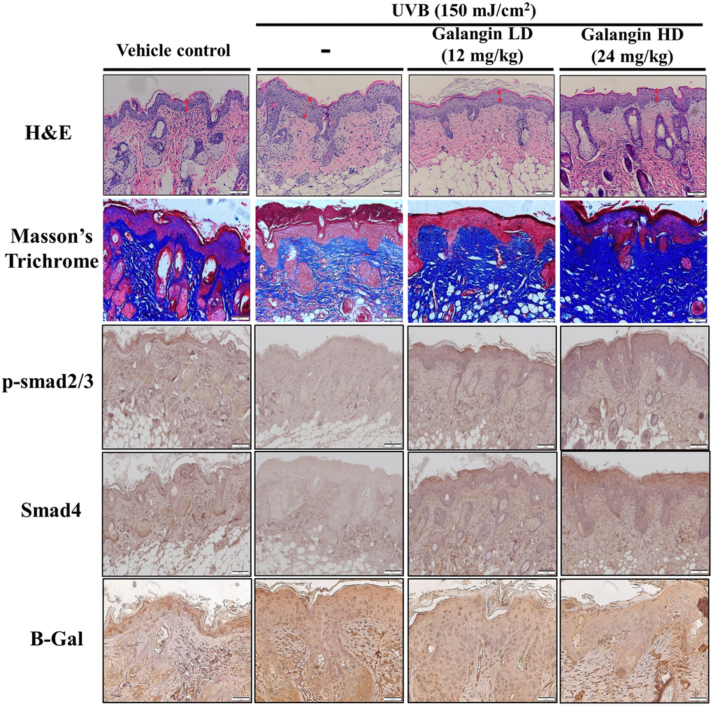 Topical application of galangin attenuates UVB-induced skin hyperplasia and collagen degradation as well as enhances TGFβ/Smad signaling in the dorsal skin of C57BL6/J nude mice