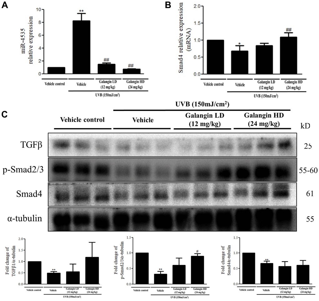 In this study, we identified that the protective role of galangin is mediated through attenuation of hsa-miR-4535 that targets Smad4, thus regulating Smad2/3/4 signaling as well as collagen synthesis in the skin exposed to H2O2/UVB-induced dermal damage in vitro and in vivo. Our findings can be summarized as six main points: (1) galangin attenuated H2O2-induced HS68 cell senescence but not apoptosis at 30 μM dose; (2) H2O2/UVB-induced intracellular and mitochondrial ROS formation and MMP imbalance were reversed following galangin treatment; (3) galangin significantly enhanced TGFβ/Smad signaling as well as Samd2/3/4 complex activation in H2O2-exposed cells; (4) upregulation of hsa-miR-4535 by H2O2/UVB was suppressed following galangin treatment; (5) hsa-miR-4535 is involved in regulating TGFβ/Smad signaling by targeting Smad4 to impaired collagen synthesis in H2O2/UVB-exposed cells; (6) topical application of galangin on the dorsal skin of nude mice significantly reduced UVB-induced skin photoaging, wrinkle formation, skin hyperplasia, and the impairment of TGFβ/Smad signaling pathways.