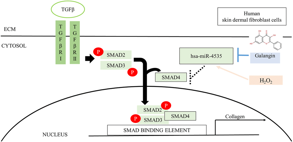 In conclusion, our findings indicated that galangin protects against H2O2/UVB-induced ROS generation, MMP imbalance, cellular senescence, and collagen degradation in human dermal fibroblasts. The dermo-protective effects of galangin were associated with the inhibition of hsa-miR-4535 and the activation of Smad2/3/4 complex to enhance collagen synthesis. Smad2/3/4 complex activation was regulated by hsa-miR-4535 through binding to Smad4-3′-UTR. Therefore, the protective mechanism of galangin against H2O2/UVB-induced skin dermal damage may involve the inhibition of Smad4/collagen synthesis by hsa-miR-4535.