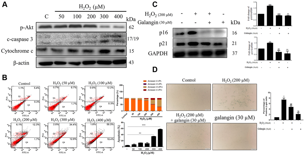 To determine whether decrease in cell viability was due to cell death or growth inhibition, we checked the expression of several apoptosis and survival markers by western blotting in HS68 cells exposed to different doses of H2O2 (50, 100, 200, 300, 400 μM) for 24 h. We found significantly decreased expression of survival markers, such as p-Akt, and increased expression of apoptosis-related markers, such as cleaved-caspase 3 and cytochrome c, at concentrations >200 μM H2O2 (Figure 2A). Furthermore, we performed flow cytometry to assess apoptotic cells using Annexin V and PI staining and observed similar results. Taken together, 200 μM H2O2 did not cause HS68 cell apoptosis (Figure 2B). Next, we detected the expression of several senescence markers, such as p16, p21, and SA-β-gal, to determine the senescent cells. Our results showed that galangin treatment significantly decreased the H2O2-induced p16 and p21 protein levels as well as number of SA-β-gal-positive cells (Figure 2C, 2D).