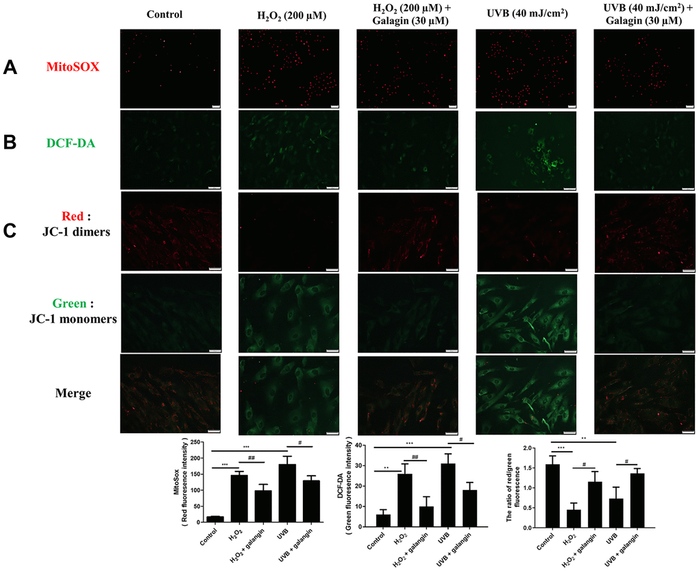 Oxidative stress plays a key role in various diseases, and can be induced by endogenous or exogenous factors. Here, we used H2O2 as an endogenous and UVB as an exogenous factor to induce oxidative damage and then investigated the ROS eliminating activities of galangin. To identify the sources of ROS, MitoSOX and DCFH-DA were used to determine intracellular and mitochondrial ROS. The staining results showed that H2O2 and UVB treatment induced ROS accumulation while galangin treatment reduced ROS generation (Figure 3A, 3B). In addition, as imbalanced MMP can initiate cell death, we used JC-1 to determine changes in MMP. Normal mitochondria fluoresced red (JC-1 dimers) while impaired mitochondria fluoresced green (JC-1 monomers). UVB and H2O2 exposure induced high levels of green fluorescence. Notably, galangin treatment shifted the green fluorescence to red, indicating revival of mitochondrial functions (Figure 3C).