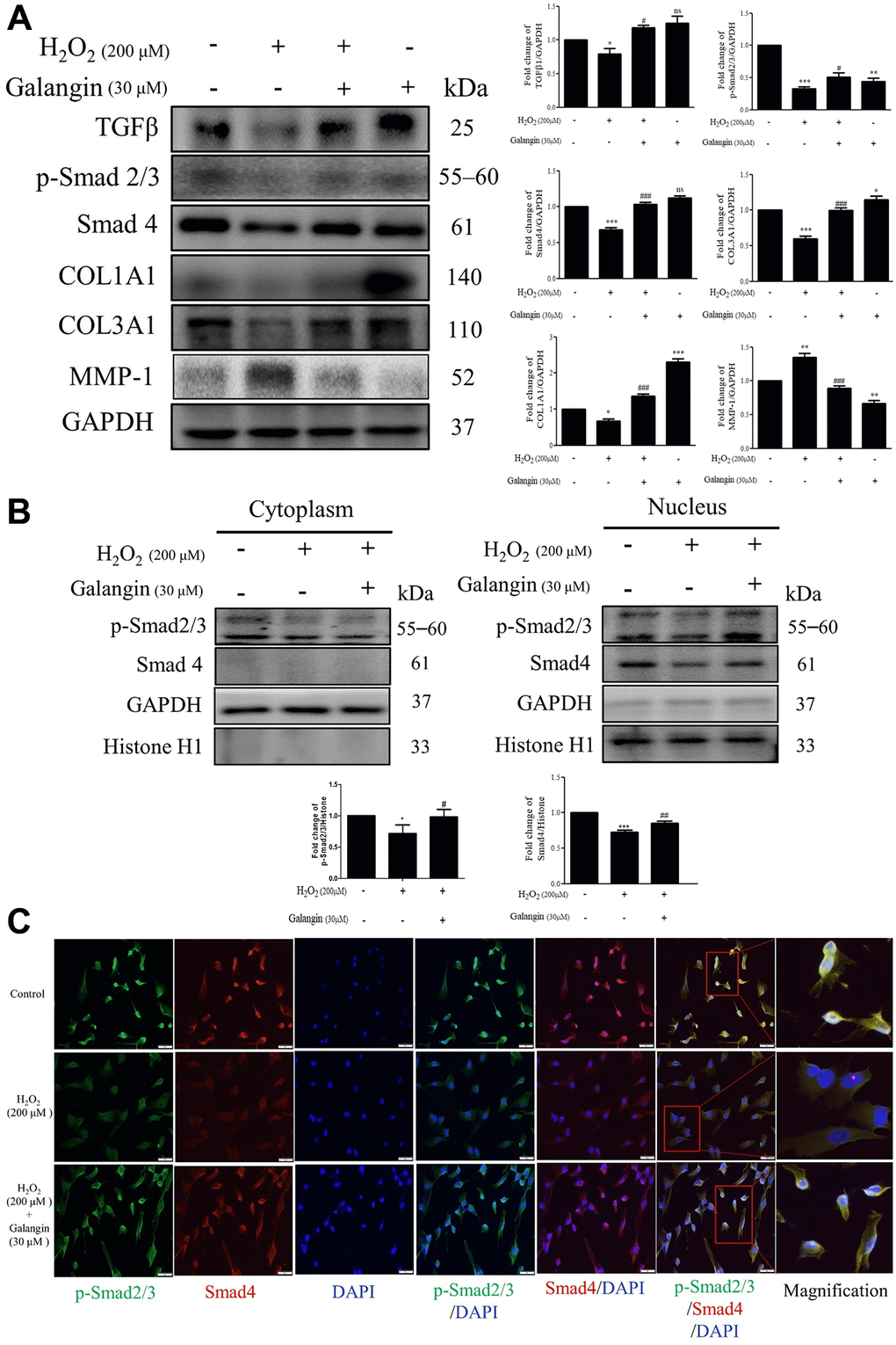 TGFβ/Smad signaling is conducive to collagen formation in human skin dermal fibroblasts [25–27]. Therefore, we investigated the role of galangin in collagen synthesis via TGFβ/Smad pathway in HS68 cells exposed to H2O2. Western blot results indicated that galangin significantly enhanced TGFβ/Smad signaling as well as collagen synthesis in H2O2-exposed HS68 cells (Figure 4A). Moreover, disorganization of collagen type I and III is one of the typical characteristics of aged skin fibroblasts [28]. Since the MMP family has been implicated in collagen catabolism [29], we next confirmed the influence of galangin on MMP-1 activation. We found that galangin prevented collagen degradation in HS68 cells by suppressing H2O2-enhanced MMP-1 level (Figure 4A). Furthermore, we identified the subcellular molecular mechanism underlying this protective action by comparing HS68 cells treated with H2O2 alone or co-treated with galangin using immunoblotting and immunofluorescence staining. Galangin treatment enhanced nuclear accumulation of p-smad2/3 and Smad4 that was disrupted by exposure to H2O2 in HS68 cells (Figure 4B, 4C). These findings indicated that galangin may ameliorate H2O2-induced collagen fragmentation by activating TGFβ/Smad pathway in HS68 cells.