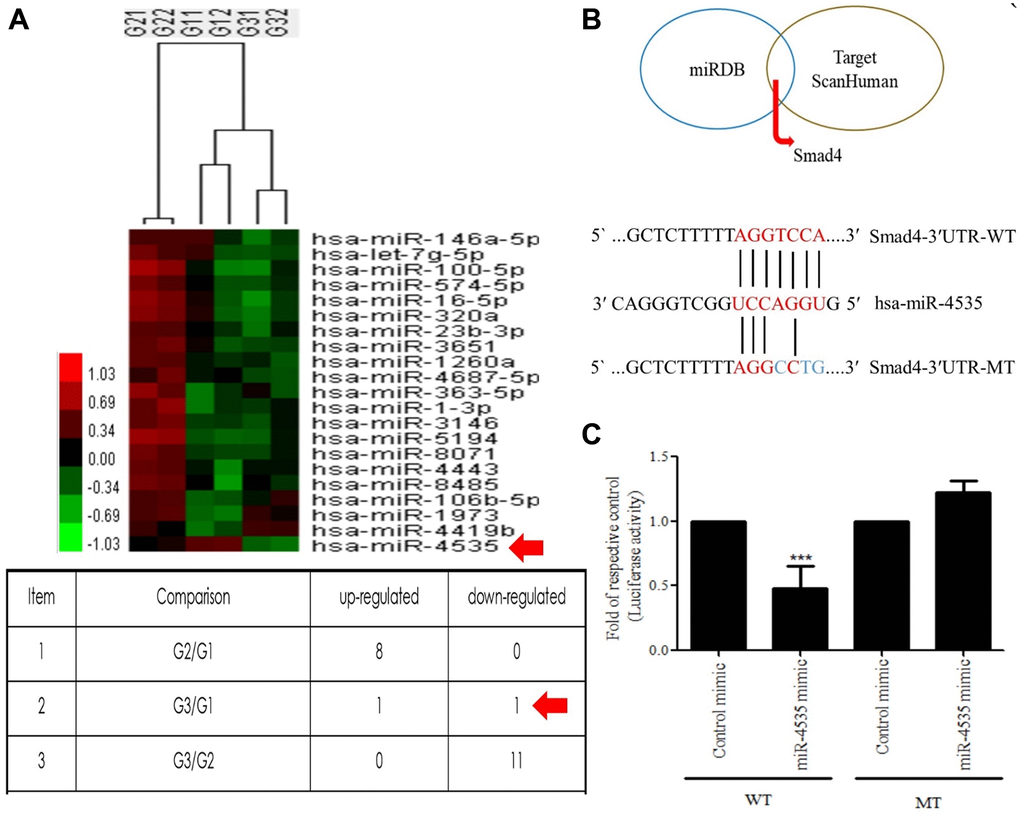 Plasmid encoding Smad4-3′-UTR in pmirGLO dual-luciferase miRNA target expression vector was purchased from GENEWIZ. Human siRNA Smad4 (ID-SASI_Hs01_00207793) and negative control siRNA (SIC001) were both purchased from Sigma-Aldrich. HS68 cells were transfected with hsa-miR-4535 inhibitor (anti-sense RNA), hsa-miR-4535 mimic (sense RNA), miRNA negative control, Smad4 siRNA using jetPRIME® (Polyplus Transfection Inc, Illkirch, France) according to the manufacturer’s protocol. Then, the cells were incubated with the transfection complexes for 24 h.