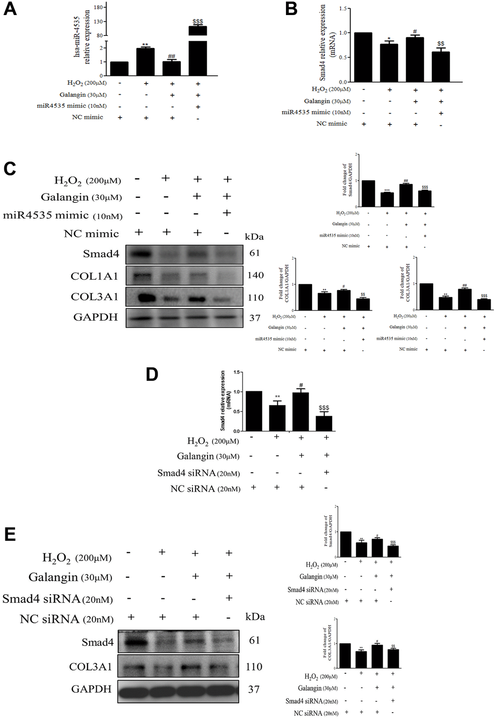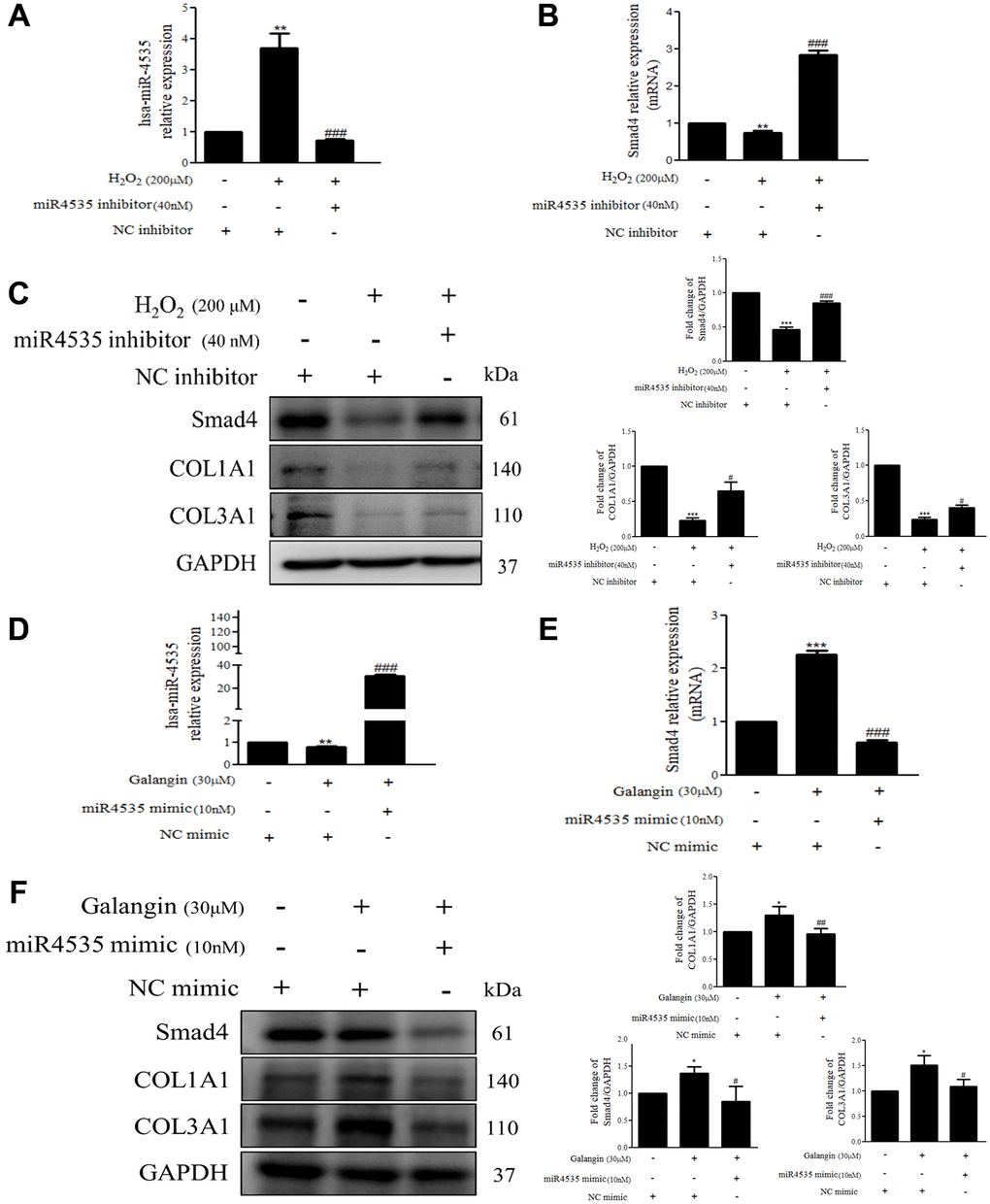 To further determine the mechanisms by which hsa-miR-4535 exerts its effect on the expression of Smad4 and its downstream signaling in HS68 cells, we transfected HS68 cells with hsa-miR-4535 mimics or inhibitors and measured Smad4 and its downstream collagen expression. The results demonstrated that inhibition of hsa-miR-4535 by hsa-miR-4535 inhibitor significantly reversed the downregulation of Smad4 mRNA and protein expression in H2O2-treated HS68 cells (Figure 7A–7C). Moreover, suppression of hsa-miR-4535 partially restored H2O2-induced COL1A1 and COL3A1 impairment in H2O2-treated HS68 cells (Figure 7C). Conversely, enhanced hsa-miR-4535 expression as a result of hsa-miR-4535 mimic transfection blocked the galangin-mediated upregulation of Smad4 in HS68 cells exposed to H2O2 (Figure 7D–7F). Overexpression of hsa-miR-4535 partially reduced galangin-induced COL1A1 and COL3A1 levels (Figure 7F). The overexpression of hsa-miR-4535 (Figure 8A–8C) or inhibition of Smad4 by siRNA (Figure 8D, 8E) resulted in reduced collagen synthesis under galangin treatment following H2O2 exposure. Surprisingly, we found that both direct Smad4 silencing and treatments with hsa-miR-4535 mimic reversed galangin-induced collagen synthesis in H2O2-treated HS68 cells. Taken together, we concluded that galangin regulated collagen synthesis, potentially via decreasing hsa-miR-4535 level to enhance Smad4 signaling in HS68 cells exposed to H2O2.