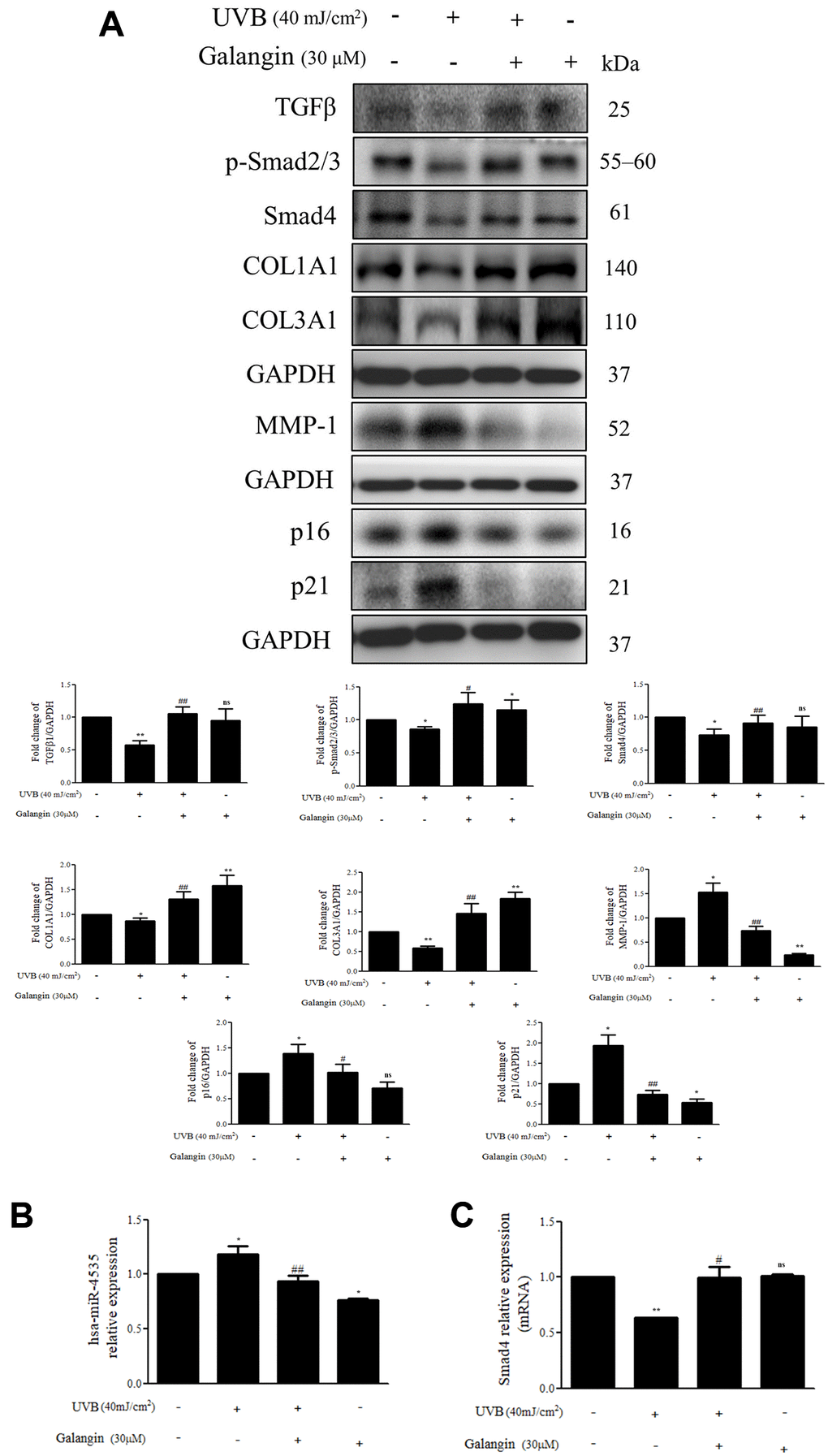 Galangin enhances TGFβ/Smad collagen synthesis pathway and attenuates dermal senescence as well as inhibition of hsa-miR-4535 expression in UVB-exposed HS68 cells