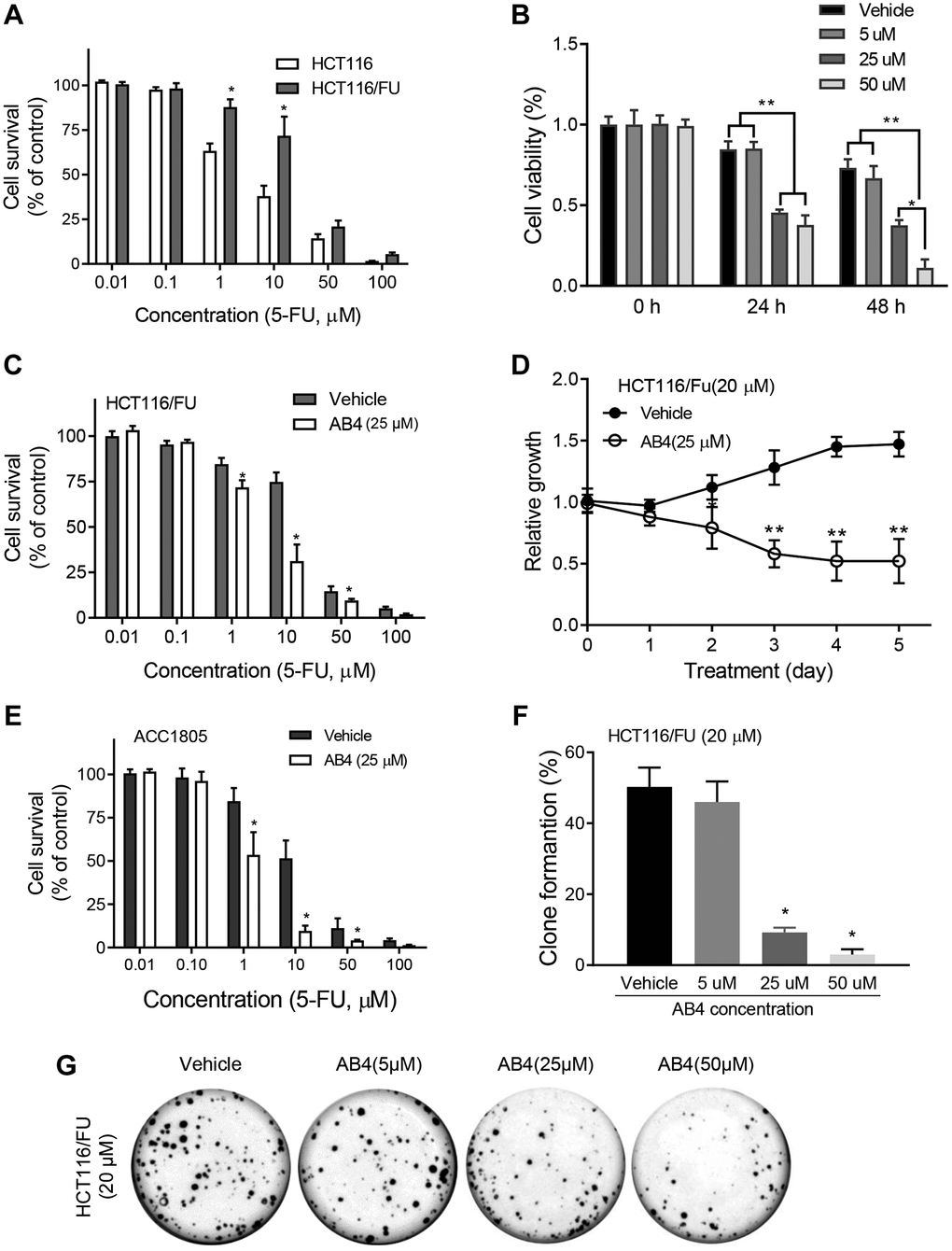 FU resistant colorectal cancer cells, HCT116/FU cells were prepared with gradient elevated concentration of 5-FU for six months. HCT116/FU cells showed increased cell survival than the parental cells with MTT assays (Figure 1A). Then we evaluated the antiproliferative effects of combined treatment of 5-FU and a gradient of AB4 in HCT116/FU cells by MTT assays. The cell viability analysis revealed that combined treatment of AB4 (≥25 μM) notably restrained the proliferation of HCT116/FU cells (Figure 1B). Further studies demonstrated significantly decreased cell survival in 5-FU resistant HCT116 cells with combined 25 μM AB4 treatment than 5-FU only (Figure 1C). Notably, 25 μM AB4 significantly inhibited the proliferation of HCT116/FU cells in 5 days treatment, which indicated AB4 reversed 5-FU resistance in vitro (Figure 1D). Similar results were observed in AB4 treated ACC1805 cells, a primary colorectal cancer cell (Figure 1E). Colony formation assay was performed to measure the long-time survival inhibition effects of AB4 treatment. As expected, cell survival rate was reduced obviously in AB4 treatment groups in a dose-dependent manner (Figure 1F), which showed reduced number of cell colonies in AB4 treated group (≥25 μM) than other ones (Figure 1G). These results supported AB4 sensitizes chemotherapy resistant colorectal cancer to 5-FU in vitro.
