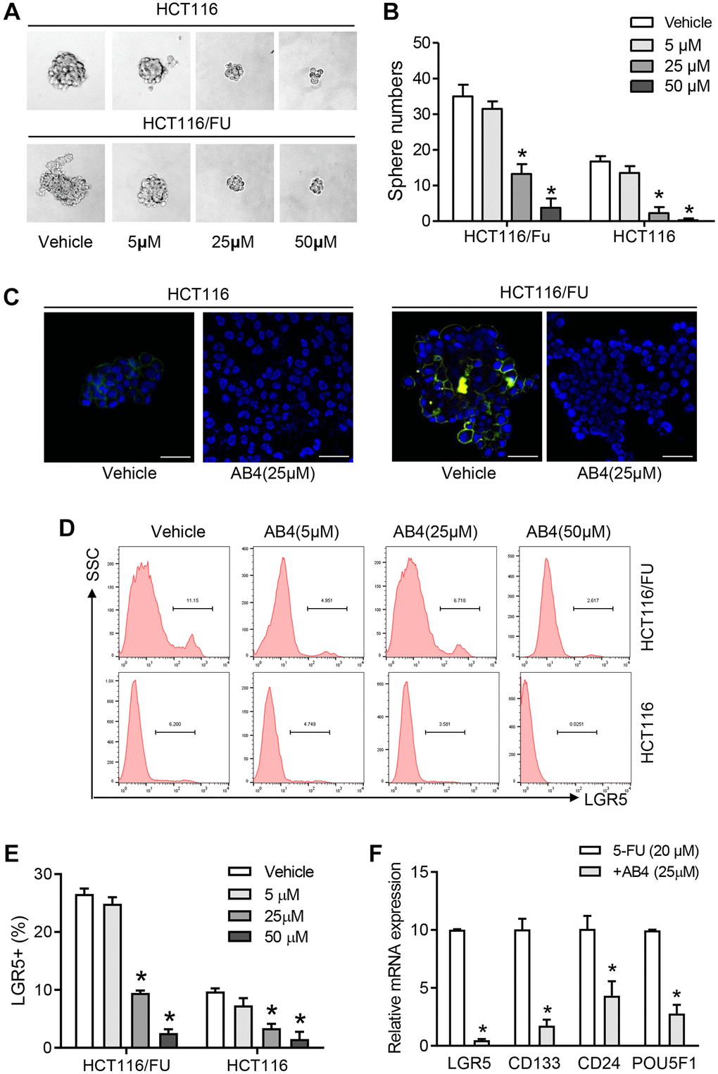 Further studies were performed for the stemness related traits of AB4 treated 5-FU resistant colorectal cancer cells. Our studies indicated that AB4 treatment suppressed tumor sphere formation in suspension culture of HCT116 and HCT116/FU cells, which showed decreased sphere volumes in AB4 treated cells than the control groups (Figure 2A). A significant decrease in the number of sphere-forming cells indicated a reduced self-renewal capacity of the AB4 treated cells (AB4 > 25 μM, Figure 2B). Immunofluorescent staining with HCT116/FU and HCT116 sphere cells indicated that AB4 treatment decreased the expression levels of LGR5 (Figure 2C), which was an important biomarker for colorectal cancer stem cells. Furthermore, after 48 h culture with gradient concentrations of AB4, the percentage of LGR5+ or CD133+ cells were significantly decreased with flowcytometry analysis (AB4 > 25 μM, Figure 2D, 2E). Further PCR analysis also indicated decreased mRNA levels of cancer stem cell biomarkers in 25 μM AB4 treated HCT116/FU sphere cells, including LGR5, CD133, CD24 and POU5F1 (Figure 2F). Taken together, these data suggested that AB4 was an effective agent in inhibiting self-renewal capacity of colorectal cancer cells.