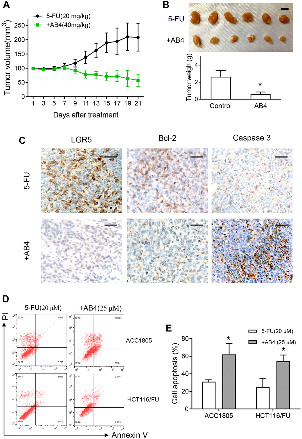 We further investigated the therapeutic efficacy of AB4 on tumor growth of colorectal cancer in vivo. Dissociated HCT116/FU cells were subcutaneous implanted into athymic nude mice until the xenograft was about 100 mm3. Then the mice were treated with intravenous infusion with 5-FU and AB4 or vehicle every three days. Tumors in AB4-treated mice showed decreased tumor growth compared to only 5-FU treated ones (Figure 3A). Moreover, AB4-treated tumors showed significantly lower volume and weight than the control group (Figure 3B). IHC staining was performed with the xenografts, which showed AB4 treatment decreased LGR5 expression in xenografts (Figure 3C). Notably, decreased Bcl-2 and increased Caspase-3 expression was observed in the AB4 treated tumors (Figure 3C). Furthermore, flowcytometry analysis was performed to measure cell apoptosis with AB4 treatment. Compared to vehicle control group, combined AB4 treatment significantly increased early and late apoptosis percentages of HCT116/FU and ACC1805 cells, a primary colorectal cancer cell line (p < 0.01, respectively. Figure 3D, 3E). Collectively, these results indicated that AB4 promoted apoptotic cell death of 5-FU resistant colorectal cancer cells.