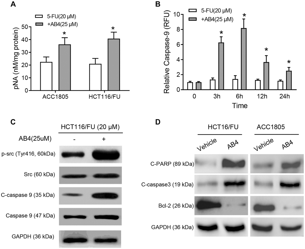 Our study indicated that AB4 displayed synergistic activity with 5-FU treatment in colorectal cancer cells. More importantly, AB4 treatment reversed 5-FU resistance and eliminated cancer stem cells of colorectal cancer. Mechanically, we found that AB4 enhanced colorectal cancer cell apoptosis through Src-dependent caspase-9 apoptotic pathway. Increased Src activation induced caspase-9 phosphorylation to sensitize 5-FU cytotoxicity. Our findings shed light to the mechanism study of 5-FU chemotherapy resistance, which provided a novel agent to ameliorate FU-based chemotherapeutic efficiency in colorectal cancer.