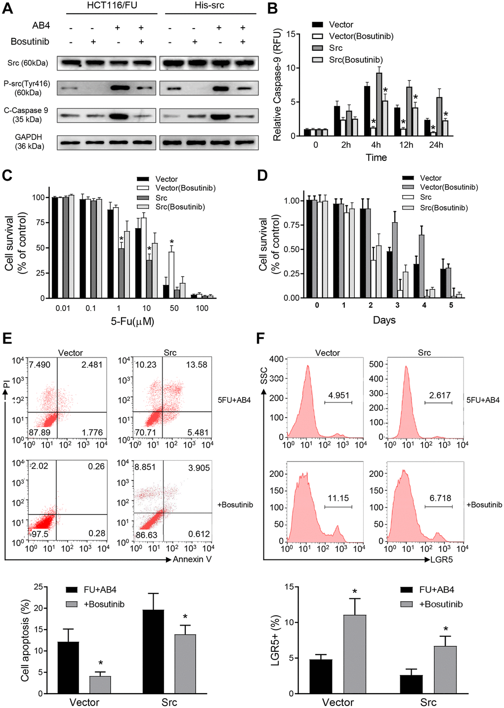 In order to assess the role of Src protein on the synergistic effects of AB4 and 5-FU treatment, HCT116/FU cells were transfected with His-Src or vector plasmids, followed by AB4/5-FU treatment and evaluation of the apoptotic pathway. Bosutinib was used for the inhibition of Src signaling pathway. Increased cleavage of caspase-9 was detected in the His-Src overexpressing cells with AB4 treatment, whereas dramatically decreased in Bosutinib treated HCT116/FU-vector or HCT116/FU-Src cells (Figure 5A). Our results indicated that Src phosphorylation contributed to AB4 induced caspase-9-related apoptotic pathway. Meanwhile, Src overexpression increased caspase-9 activity with AB4 treatment, and Bosutinib attenuated the caspase-9 activity in AB4 treated HCT116/FU cells (Figure 5B). MTT assays were performed to detect cell proliferation inhibition effects of 5-Fu in colorectal cancer cells. Combined treatment with Bosutinib increased cell survival rate, whereas decreased cell survival in Src-overexpressing cells than control cells (Figure 5C). Moreover, Src overexpression increased 5-FU/AB4 induced cytotoxicity compared to corresponding control cells, while Bosutinib reduced the cytotoxicity effects of the combined treatment (Figure 5D). Increased cell apoptosis was observed in Src-overexpressed cell than the control cells with combined AB4/5-FU treatment, and Bosutinib decreased cell apoptosis (Figure 5E). Flow cytometry analysis also showed lower percentage of LGR5+ cells in HCT116/FU-Src cells than control cells after AB4 treatment, whereas Bosutinib attenuated the cancer stem cell elimination effects of AB4/5-FU co-treatment (Figure 5F). Together, the above findings implicated that Src was involved in modulating apoptosis by AB4/5-FU induced caspase-9 activity. Moreover, Src-caspase-9 signaling was a promising target for colorectal cancer stem cell elimination.