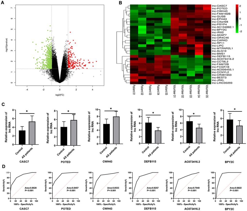 We collected 30 serum samples from both normal volunteers and AS cases in order to further investigate the expression levels of the of the top three up-regulated and the top three down-regulated differential lncRNAs. According to the results of a qRT-PCR analysis, the levels of CASC7, POTED and CWH43 were significantly decreased in AS patients as compared with healthy volunteers (P < 0.05, Figure 1C). On the other hand, the levels of DEFB115, AC073416.2 and BPY2C here all significantly higher in AS patients as compared to healthy volunteers (P < 0.05, Figure 1C). A ROC analysis also showed that these lncRNAs exerted discriminatory capabilities that could be used to differentiate between patients with AS and healthy volunteers (P < 0.05; Figure 1D).
