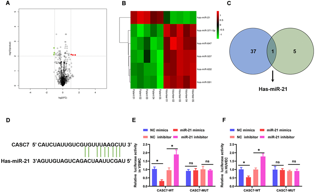 To study the detailed mechanism by which CASC7 inhibited proliferation and promoted apoptosis of VSMC and suppressed the inflammatory response of HUVEC, the differentially expressed miRNAs were analyzed by the R package “limma” based on the screening criteria of |logFC| > 0 and P value < 0.01. These results identified six miRNAs that are differentially expressed in AS patients relative to health volunteers (Figure 3A, 3B, Table 3). Next, miRNAs that might bind to the CASC7 were predicted through miRcode. As listed in Supplementary Table 1, 37 miRNAs were found to potentially bind to CASC7. Subsequently, by analyzing the intersection of predicted CASC7-targeting miRNAs with the significantly differentially expressed miRNAs, we discovered that miR-21 was common to both sets (Figure 3C). To further determine whether miR-21 is the target of CASC7, a computer-based predictive database (LncBase V2.0) was used. This analysis also predicted miR-21 to be a candidate CASC7 target (Figure 3D).