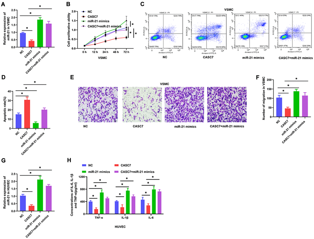 The miR-21 reverses the biological effects of CASC7 on VSMC and HUVEC
