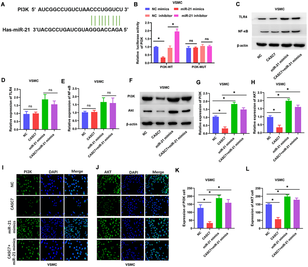 Several studies have shown that the PI3K/Akt and TLR4/NF-κB signal transduction pathways are important targets of miR-21 [29, 30]. Therefore, we further examined the interaction between miR-21 and the PI3K/Akt signaling pathway in VSMC. TargetScan 7.2 analysis suggested that miR-21 targeted PI3K (Figure 5A). However, in this study, the levels of expression of TLR4 and NF-κB were not found to be downregulated by CASC7 in VSMC treated with ox-LDL (P < 0.05, Figure 5C–5E). Therefore, the interaction of miR-21 with PI3K activity in VSMC was tested through luciferase reporter assays. These assays showed that the miR-21 mimics reduced translation of luciferase from an mRNA that contains a putative miR-21 target region from PI3K mRNA, whereas the miR-21 inhibitor increased the luciferase activity (P < 0.05, Figure 5B). Consistently, protein levels of PI3K and Akt were significantly reduced upon expression of CASC7, and this effect could be rescued by expression of miR-21 mimics in VSMC (P < 0.05, Figure 5F–5H). Additionally, Akt and PI3K levels were elevated in the miR-21 mimics group relative to the group in which both CASC7 and miR-21 were overexpressed, as revealed by an immunofluorescence assay in VSMC (P < 0.05, Figure 5I–5L).