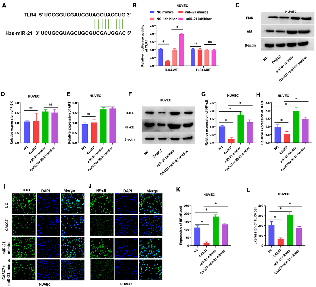 Levels of TLR4 and NF-κB, but not PI3K and Akt (P > 0.05, Figure 6C–6E), were decreased in HUVEC overexpressing CASC7 relative to the NC group. Similarly, another candidate miR-21 target predicted by the TargetScan software was TLR4 (Figure 6A). Accordingly, miR-21 mimics decreased TLR4-dependent luciferase activity within cells expressing wild-type TLR4, whereas an miR-21 inhibitor increased the luciferase activity downstream of TLR4 (P < 0.05, Figure 6B). According to Western blot assays, overexpression of CASC7 restrained the levels of TLR4 and NF-κB proteins, and this inhibitory effect of CASC7 was reversed by the expression of miR-21 mimics in HUVEC (P < 0.05, Figure 6F–6H). Similarly, NF-κB and TLR4 levels were elevated within cells expressing CASC7 and the miR-21 mimics relative to those expressing only CASC7, according to immunofluorescence assays (P < 0.05, Figure 6I–6L).