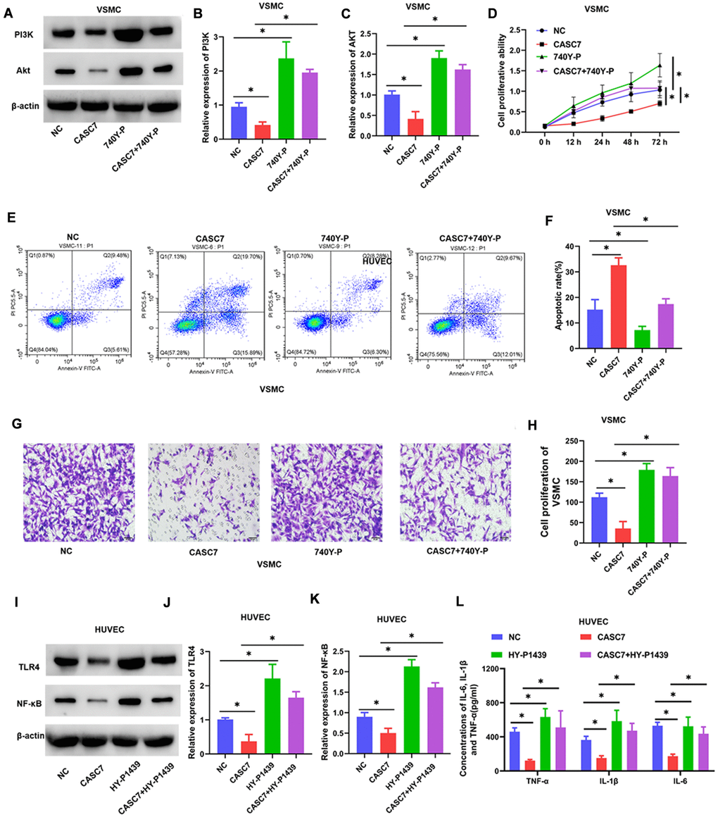 To investigate the role of PI3K in the regulation of VSMC by CASC7, the specific PI3K agonist 740Y-P was used to activate the PI3K/Akt signaling pathway. As shown in Figure 6, 740Y-P increased the protein levels of PI3K and Akt (P < 0.05, Figure 7A–7C). In addition, treatment with 740Y-P significantly inhibited the effect of expression of CASC7 on decreasing the proliferation (P < 0.05, Figure 7D) and the migration (P < 0.05, Figure 7G, 7H) of VSMC, and the promotion of apoptosis was also reversed by the PI3K agonist in VSMC (P < 0.05, Figure 7E, 7F).