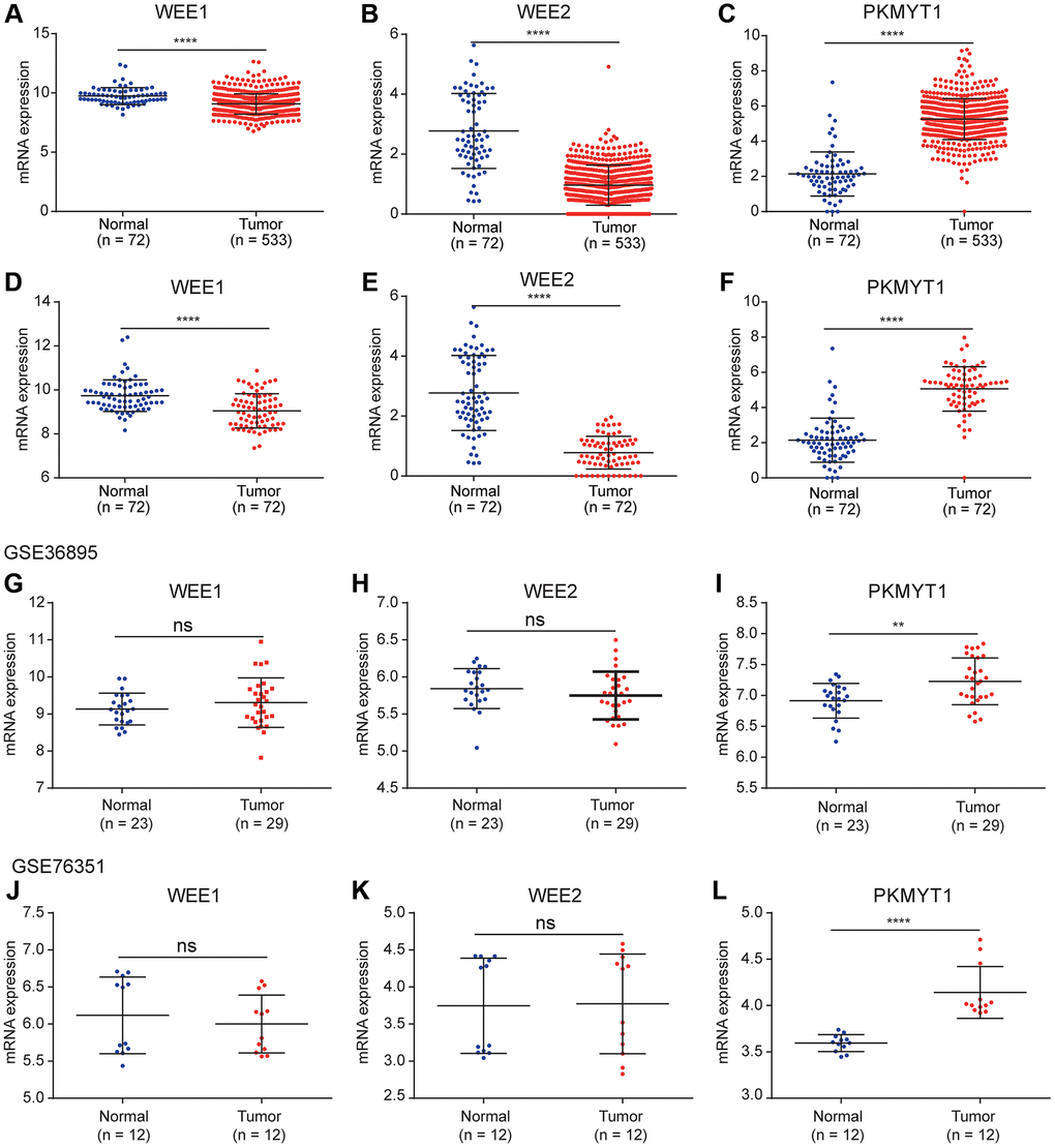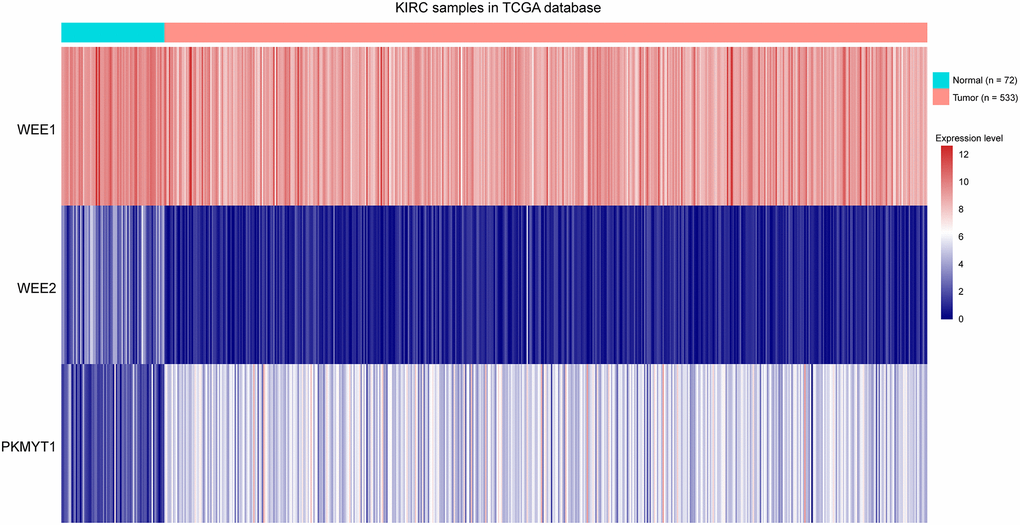 To explore the roles of WEE family kinases in ccRCC, we first investigated mRNA expression levels of the three members of WEE family kinases in multiple datasets. A heat map was used to illustrate the overall expression levels of the three members of WEE family kinases between normal and tumor samples in the TCGA dataset (Figure 1). Then, we compared expression levels of the three members between control and tumor samples. We observed down-regulated levels of WEE1 and WEE2 and up-regulated levels of PKMYT1 in tumors compared to normal samples for all samples in the TCGA dataset (Figure 2A–2C). We also compared expression levels of paired normal and tumor samples in the TCGA dataset, and found down-regulated levels of WEE1 and WEE2 and up-regulated levels of PKMYT1 in tumors (Figure 2D–2F). Consistently, we also compared mRNA expression levels of the three members in the GSE36895 (Figure 2G–2I) and GSE76351 datasets (Figure 2J–2L). In the validated GEO datasets, we obtained similar analytical results, in which we found up-regulated levels of PKMYT1 in tumors compared with normal samples. While, expression levels of WEE1 and WEE2 showed no significant differences between tumor and normal samples, but all results displayed overexpression of PKMYT1 in tumors.