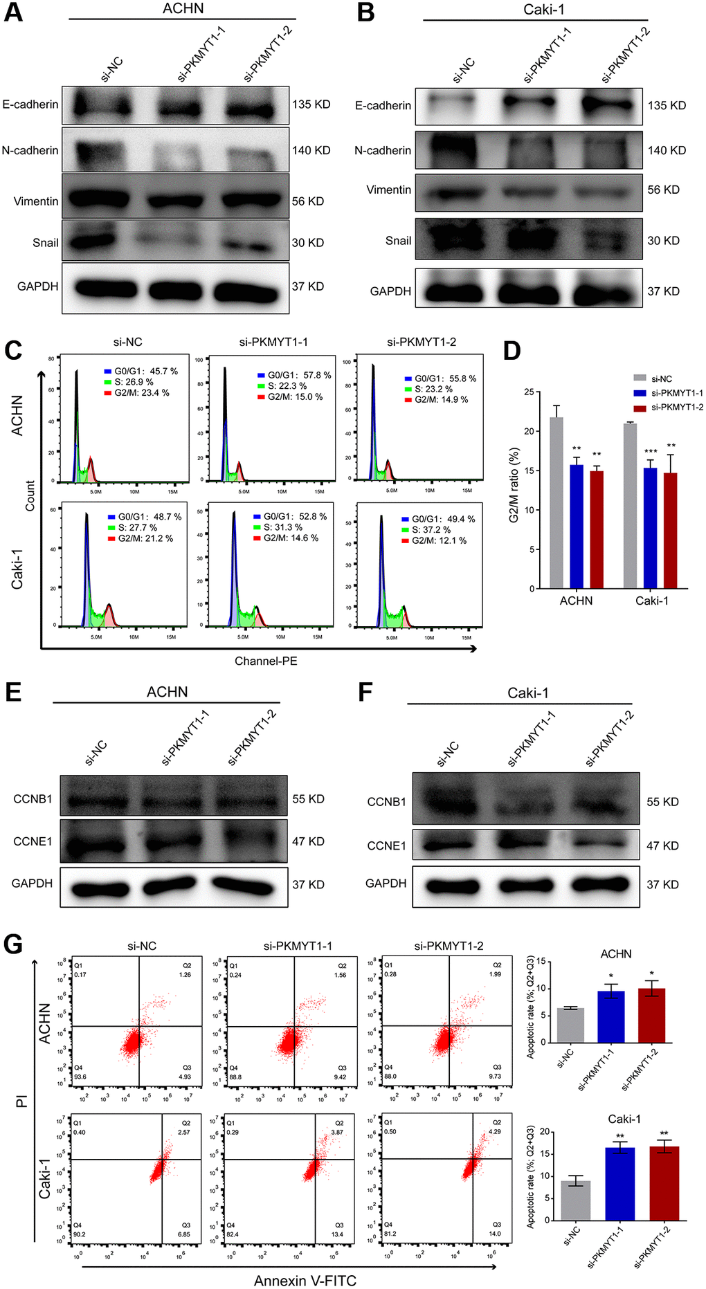 Based on the functional enrichment analysis, we speculated that the cell cycle-related pathway might underlie the potential functional mechanism of PKMYT1. Therefore, we designed two different siRNAs and subsequently transfected into ccRCC cells to knock down the expression of PKMYT1 gene. Based on flow cytometry experiments to detect the cell cycle, our results exhibited that the proportion of cells in G2/M phase was reduced in ACHN and Caki-1 cell lines when transfected with PKMYT1 siRNA (Figure 10C, 10D). The previous GSEA analysis revealed that PKMYT1-interplaying proteins are closely associated with cell cycle progression. Then we explored the protein expression of indispensable cyclin genes such as CCNB1 and CCNE1 in ccRCC cells. The results showed that all of these cell cycle-associated proteins were reduced in the PKMYT1 knockdown groups (Figure 10E, 10F). Taken together, these findings indicated that PKMYT1 promotes cell proliferation by affecting the cell cycle. Additionally, to investigate the influence of PKMYT1 on ccRCC cell apoptosis, flow cytometry analysis was performed. We observed that the apoptosis rate of the siRNA groups in ACHN and Caki-1 cell lines was higher than negative control group (Figure 10G).