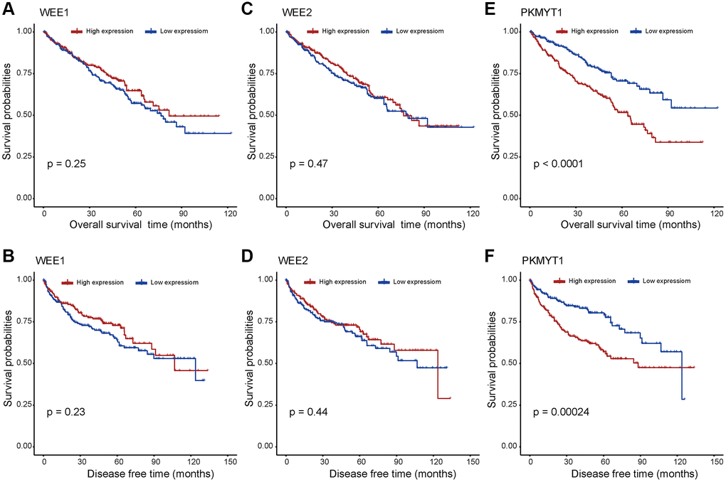 Prognostic significance assessment of WEE family kinases in ccRCC using Kaplan–Meier curves analysis. Based on the median values of mRNA expression, we divided the patients into high and low expression groups respectively. The Kaplan–Meier curves demonstrated the overall survival of ccRCC patients, and the results reflect the poor prognosis of the PKMYT1 high expression group (Figure 3E).