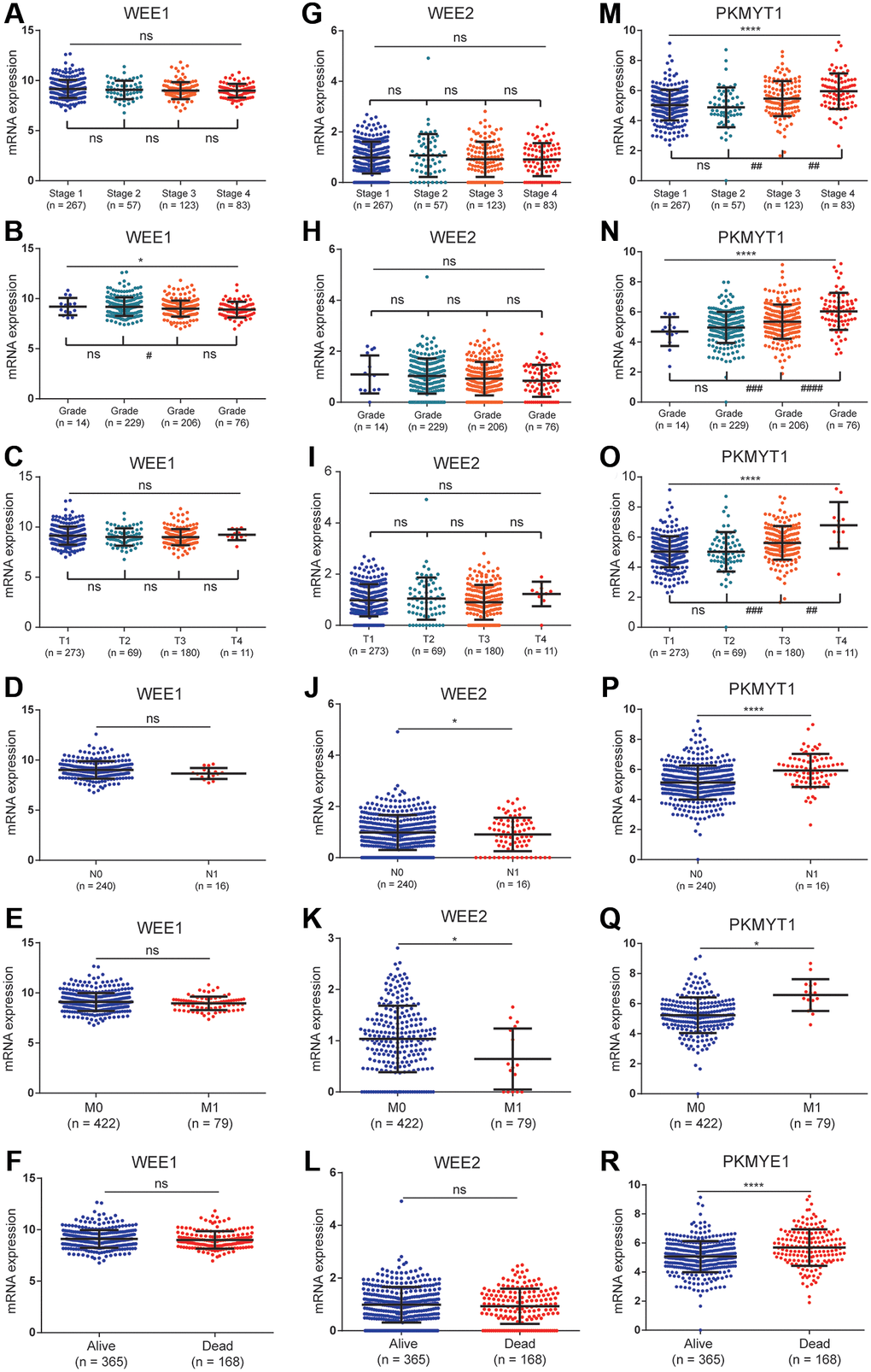 The relationships between clinical variables and the expression levels among WEE family kinases were evaluated in the TCGA dataset. Expression levels of WEE1 were negatively correlated with pathological grade (Figure 4B). However, expression levels of WEE1 showed no significant differences between groups for pathological stage (Figure 4A), pathological T stage (Figure 4C), lymphatic metastasis (Figure 4D), distant metastasis (Figure 4E) or survival status (Figure 4F).