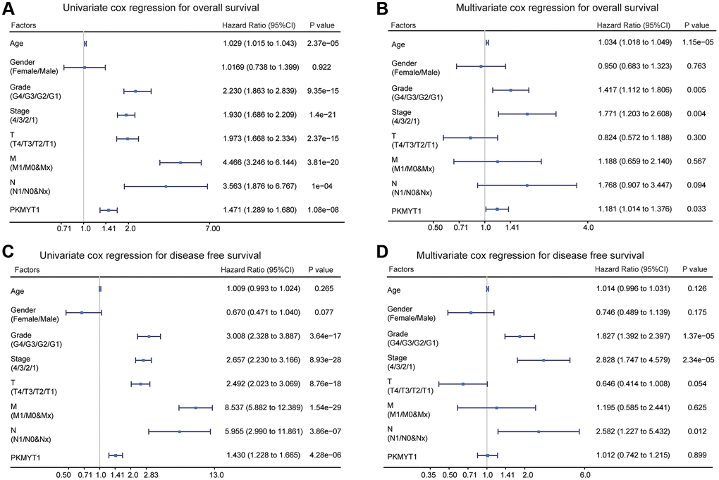 Patients were classified into high and low expression groups based on the median expression value of PKMYT1, and associations with the distributions of clinical phenotypes were investigated. The results showed that high proportions of higher T stage, distant metastasis, advanced stage, lymphatic metastasis, and higher grade in the high expression group of PKMYT1 (Table 1). However, the distributions of age and gender showed no significant difference. Furthermore, we evaluated overall survival and disease-free survival in ccRCC patients by univariate and multivariate Cox regression analysis. The results showed that PKMYT1 was a risk factor for overall survival (Figure 5A) and disease-free survival (Figure 5C) via univariate Cox regression analysis. The expression levels of PKMYT1 were a risk factor for overall survival in ccRCC patients after integration with multiple clinical factors (Figure 5B) through multivariate Cox regression analysis. However, expression levels of PKMYT1 with respect to disease-free survival showed no significant difference (Figure 5D). Based on the aforementioned findings, we confirmed that PKMYT1 is an autonomous risk factor affecting overall survival of ccRCC patients, which might provide a supplement for clinical factors.