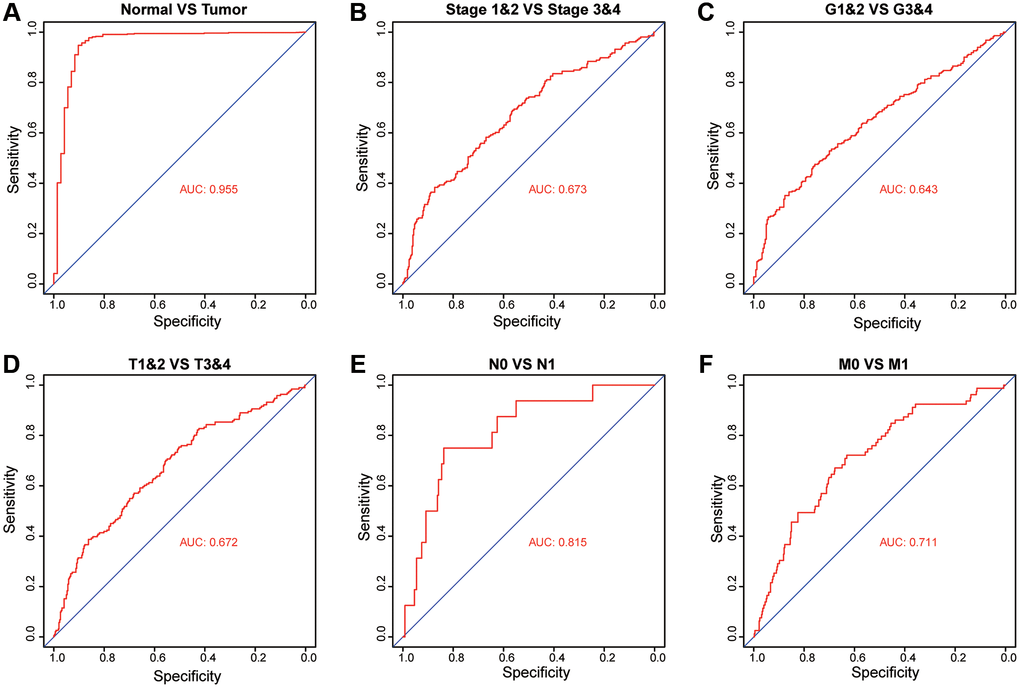 To investigate whether the expression of PKMYT1 has diagnostic value in ccRCC patients, we performed receiver operating characteristic (ROC) investigation and calculated the area under the curve (AUC) to evaluate the diagnostic efficiency. We found that PKMYT1 sufficiently differentiated ccRCC patients from normal controls when the area under the AUC curve was 0.955 (Figure 6A). In addition, the diagnostic value of PKMYT1 expression levels were also evaluated for stage I + II vs. stage III + IV (AUC, 0.673; Figure 6B), (G1 + G2) vs. (G3 + G4) stage (AUC, 0.643; Figure 6C), (T1 + T2) vs. (T3 + T4) stage (AUC, 0.672; Figure 6D), N0 vs. N1 (AUC, 0.815; Figure 6E) and M0 vs. M1 (AUC, 0.711; Figure 6F). These findings suggest that PKMYT1 may serve as a potential diagnostic biomarker for ccRCC patients with excellent performance.