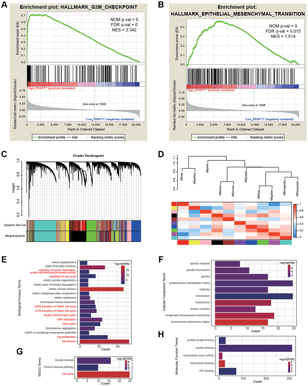To obtained genes highly correlated with the expression of PKMYT1, weighted gene co-expression network analysis (WGCNA) model was adopted to evaluate closely connected modules [33]. We first selected genes according to coefficient of variation values greater than 0.1. Then, we constructed a scale-free co-expression network for selected genes using the “WGCNA” R package [34]. All genes in the module in which PKMYT1 was located were selected. GO (Gene ontology) and KEGG (Kyoto Encyclopedia of Genes and Genomes) enrichment analyses were performed to visualize and annotate these genes highly associated with PKMYT1. Only terms with FDR-value of <0.05 were regarded markedly enriched.