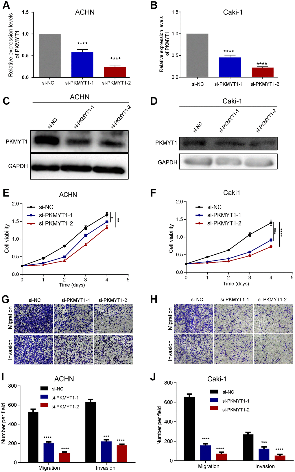 To examine the effect of PKMYT1 in the biological medicine of ccRCC, we transfected si-PKMYT1 into RCC cell lines (ACHN and Caki-1) by down-regulated its expression levels. The down-regulated mRNA levels of PKMYT1 were confirmed using qRT-PCR for ACHN cells (Figure 9A) and Caki-1 cells (Figure 9B) compared to the corresponding negative control. Down-regulated protein levels of PKMYT1 were confirmed using western blotting assays for ACHN cells (Figure 9C) and Caki-1 cells (Figure 9D) compared to the corresponding negative control. Subsequently, whether PKMYT1 gene has an effect on cell migration, proliferation and invasion, a series of assays were performed.
