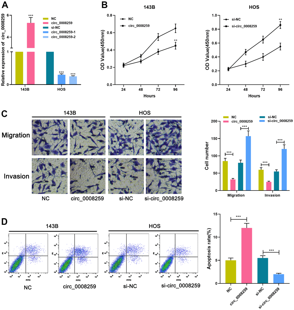 Circ_0008259 overexpressing plasmid was accordingly modeled and specifically transfected into 143B cell line, and si-circ_0008259-1/2 was subsequently transfected into HOS cell line, with the efficiency examined by qRT-PCR, and circ_0008259-1 with the best knockdown efficiency was adopted (Figure 2A). Additionally, CCK-8, transwell and flow cytometry highlighted that circ_0008259 overexpression depressed the malignant biological behaviors of 143B cells and promoted the apoptosis (Figure 2B–2D). Meanwhile, circ_0008259 silencing worked oppositely (Figure 2B–2D). Collectively, circ_0008259 served as a tumor deterrent in OS.