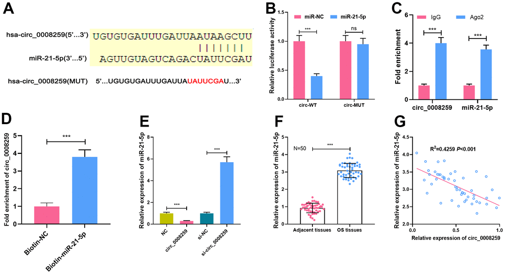 Next, Circular RNA Interactome database showed that miR-21-5p was a potential target of circ_0008259 (Figure 3A). Besides, dual-luciferase reporter assay highlighted that miR-21-5p could restrain the luciferase activity of cells transfected with circ_0008259-WT, but that the of the cells transfected with circ_0008259-mut was not greatly impacted (Figure 3B). Besides, RIP assay uncovered that circ_0008259 and miR-21-5p were predominantly enriched in Ago2 group, as against IgG group (Figure 3C). RNA pull-down experiments showed that circ_0008259 could be silenced by biotin-labeled miR-21-5p, displaying that circ_0008259 can directly bind to miR-21-5p (Figure 3D). Besides, circ_0008259 overexpression repressed miR-21-5p expressions in OS cells, while circ_0008259 silencing shown a opposite effect (Figure 3E). Additionally, we observed that miR-21-5p expression in OS tissues was higher than that in adjacent tissues, which was negatively correlated with circ_0008259 expression (Figure 3F, 3G). This evidence highlighted that miR-21-5p was the target of circ_0008259 in OS cells.