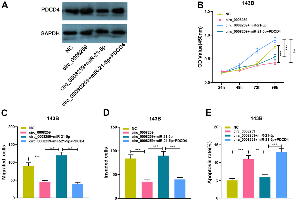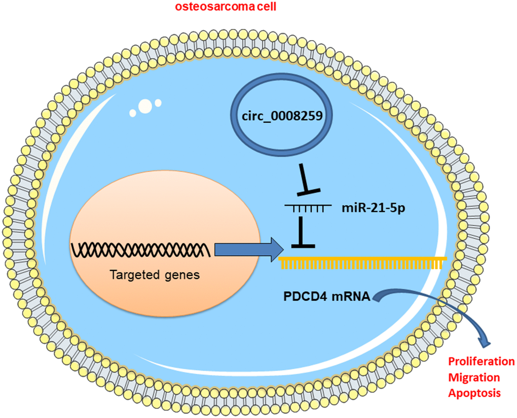 To expound the downstream mechanism of circ_0008259 in regulating the OS progression, we conducted a series of “rescue experiments” with 143B cells. Western blot showed that circ_0008259 overexpression could promote PDCD4 expression, which was weakened by the co-transfection of miR-21-5p mimics, while the co-transfection of PDCD4 overexpression plasmids enhanced PDCD4 protein expression (Figure 5A). As shown, circ_0008259 overexpression impeded the growth, migration and invasion and accelerated the apoptosis of 143B cells, while miR-21-5p mimics rescued this impact (Figure 5B–5E). Moreover, PDCD4 overexpression rescued the impacts of miR-21-5p restoration in 143B (Figure 5B–5E). In short, circ_0008259 suppressed the progression of OS via monitoring miR-21-5p / PDCD4 axis (Figure 6).