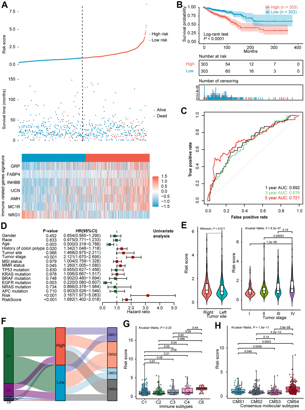 According to the median value of the risk score (0.948), the 606 CRCs in the training cohort were divided into a high-risk group (n = 303) and a low-risk group (n = 303). The distribution of risk scores, survival status as well as the expression level of seven IRGs for the two subgroups in the training cohort were correspondingly displayed in Figure 1A. Kaplan-Meier survival analysis (Figure 1B) indicated dismal prognosis for patients in the high-risk group (P < 0.0001). To assess the predictive efficiency of the constructed seven IRGs signature, time-dependent ROC curves were plotted. As shown in Figure 1C, the AUCs for 1-, 3-, 5- year survival prediction was 0.692, 0.676, and 0.721, respectively.