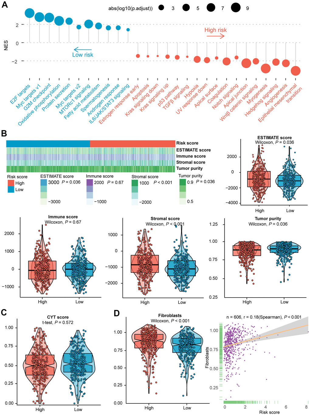 To further evaluate the potential molecular mechanism, the connection between four types of score produced by the ESTIMATE algorithm and risk score was also examined. Among the training dataset, a higher risk score was unveiled with elevated ESTIMATE score and stromal score, nevertheless, with decreased tumor purity (Figure 2B). Analogous patterns were found in the validation dataset except for a significantly positive correlation between risk score and immune score (Supplementary Figure 3B). Besides, no statistical significance was shown in the CYT score between the two subclasses (Figure 2C and Supplementary Figure 3C). It has been documented that fibroblasts are critical in multiple immunologic responses and inflammatory responses to tumor tissue injury [51, 52]. In the training group, the risk score was markedly correlated with the NES of fibroblasts (Spearman’s r = 0.18, P-value < 0.001, Figure 2D). Likewise, we found increased NES in high-risk subgroup of the validation cohort (Supplementary Figure 3D).