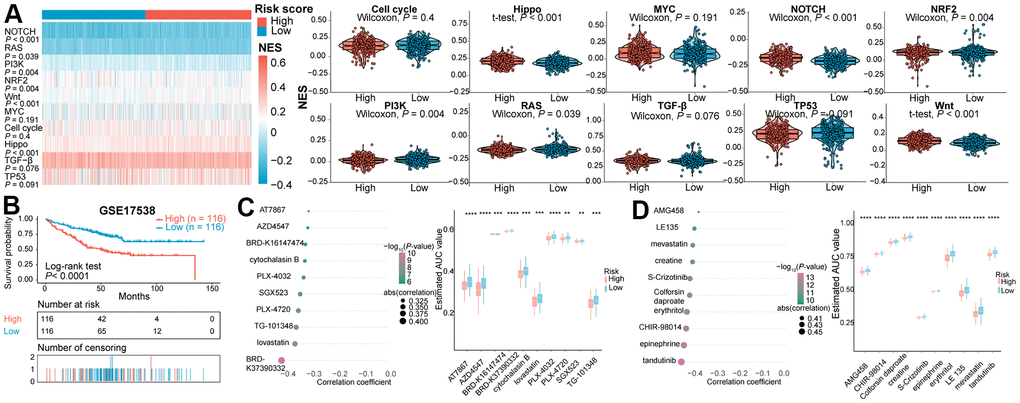 Besides, variation in the NES values of 10 common oncogenic pathways between the two subclasses were evaluated in the TCGA COAD and READ patients (Figure 3A). The Hippo-, Notch-, NRF2- and Wnt-related pathways exhibited significantly higher NES values in high-risk subtype than in low-risk subtype. The NES values of the PI3K, RAS, and TP53-related pathways were significantly higher in the immune risk score-low subtype than in the immune risk score-high subtype. Analogous effects in Hippo-, Notch- and Wnt-associated pathways were investigated in the GSE39582 validation cohort (Supplementary Figure 5C).