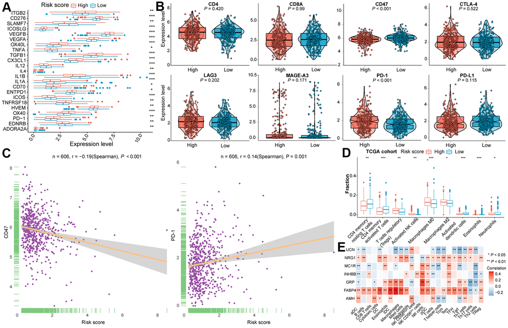 Immunomodulators (IM) play a determinant role in clinical oncology and plenty of IM-related agonists and antagonists are being assessed [53]. To further figure out the underlying immune modules of the constructed IRGs model, the IM gene expression level between two subgroups in two CRC cohorts was compared. Among the IMs under investigation for cancer immunotherapy, certain of them were significantly related to the risk score (Figure 4A and Supplementary Figure 4A, 4B). In addition, we deeply investigated whether the risk score was associated with the expression level of T cell markers (CD4 and CD8A) and with six vital immune checkpoint genes (CD47, CTLA-4, LAG3, MAGE-A3, PD-1, and PD-L1). As shown in Figure 4B, the expression level of PD-1 was significantly higher in CRC of the high-risk subtype, while the risk score was negatively correlated with CD47 expression. Moreover, the differences in the expression level of CD47 and PD-1 between two subtypes of the TCGA dataset were statistically significant (Figure 4C). Even though the expression level of CD4 inclined to be elevated in high-risk subclass, no statistical difference was determined in the TCGA cohort. Statistical significance was verified in the validation cohort (Supplementary Figure 4C).