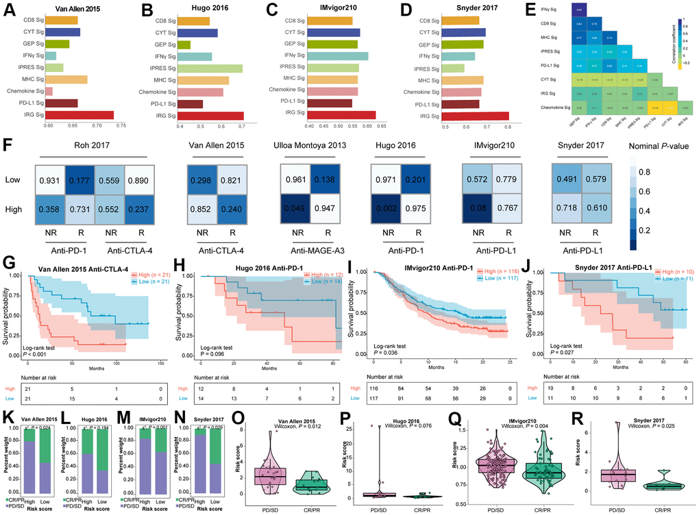 Patients received immunotherapy in Van Allen et al. (2015) dataset, Hugo et al. (2016) dataset, IMvigor210 dataset, and Snyder et al. (2017) dataset were classified into high-risk subtype and low-risk subtype using the median IRGs-based risk score as the cutoff. Then, the AUC values for classifying the responder and non-responder cases of several previous signatures, including CD8 [65], CYT [17], T cell-inflamed GEP [66], IFNγ [66], IPRES [67], MHC [68], Chemokine [69], and PD-L1 [65] signatures as well as IRGs-based signature were calculated across all the four immunotherapeutic datasets with abundant gene expression profiles. Notably, IRGs signature outperformed the other eight signatures and the AUC values exceeded 0.7 in three out of four datasets (Figure 5A–5D). The results of performance comparison in four independent datasets suggested that the predictive power of IRGs signature ranked the highest. The association across these signatures indicated that five signatures, including IFNγ, CD8, MHC, IPRES, and PD-L1 signatures correlated closely with each other (Figure 5E). By contrast, IRGs signature displayed relatively weak correlation with other signatures, implying its complementary role rather than the alternative as an immunotherapeutic indicator. Patients in the low-risk subclass presented significant longer OS than those in the high-risk subclass of Van Allen et al. (2015) dataset (log-rank test P-value < 0.001, Figure 5G), IMvigor210 dataset (log-rank test P-value = 0.036, Figure 5I) and Snyder et al. (2017) dataset (log-rank test P-value = 0.027, Figure 5J), however, no statistical difference was observed in Hugo et al. (2016) dataset (log-rank test P-value = 0.096, Figure 5H). These findings demonstrated that the lower risk score was associated with better survival outcomes in tumor patients treated with immunotherapy. Collecting immunotherapeutic response data in four cohorts mentioned above, we determined the correlation between immunotherapeutic response and risk score. It’s shown that patients in the low-risk subtype had a dramatically higher response to immunotherapy than patients in the high-risk subtype among three datasets (P-value = 0.024 for Van Allen et al. anti-CTLA-4 cohort, P-value = 0.001 for IMvigor210 anti-PD-L1 cohort, and P-value = 0.029 for Snyder et al. anti-PD-L1 cohort; X2 test, Figure 5K, 5M, 5N), apart from (P-value = 0.194 for Hugo et al. anti-PD-1 cohort, X2 test, Figure 5L). According to Van Allen et al. (2015) anti-CTLA-4 cohort (Figure 5O), IMvigor210 anti-PD-L1 cohort (Figure 5Q), and Snyder et al. (2017) anti-PD-L1 cohort (Figure 5R), violin plots revealed that the risk score was significantly decreased in patients responsive to the immunotherapeutic invention, compared to non-responsive patients. Nonetheless, no statistical significance was observed in Hugo et al. (2016) anti-PD-1 cohort (Figure 5P).