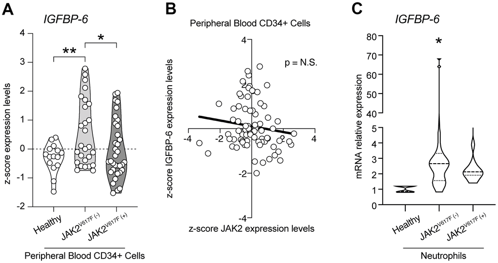 To find a potential link between JAK2 and IGFBP-6, we first analyzed the z-score expression levels of IGFBP-6 in healthy, JAK2 wild type and JAK2V617F mutant PMF patients (Figure 1A). We observed a significant increase in IGFBP-6 z-score gene expression levels in PMF patients wild type for JAK2V617F mutation compared to healthy and to PMF patients who carried the JAK2V617F mutation (Figure 1A). Furthermore, no significant modulation was observed comparing IGFBP-6 expression levels between healthy subjects and PMF patients who carried the JAK2V617F mutation. Noteworthy, we observed no significant correlation between IGFBP-6 and JAK2 expression levels in the selected samples for our analysis (Figure 1B). We then moved to analyze IGFBP-6 mRNA expression in primary isolated neutrophils positive and negative cells from PMF patients (Figure 1C). Interestingly, we observed that also in PMF JAK2WTneutrophils, IGFBP-6 mRNA expression was significantly increased.