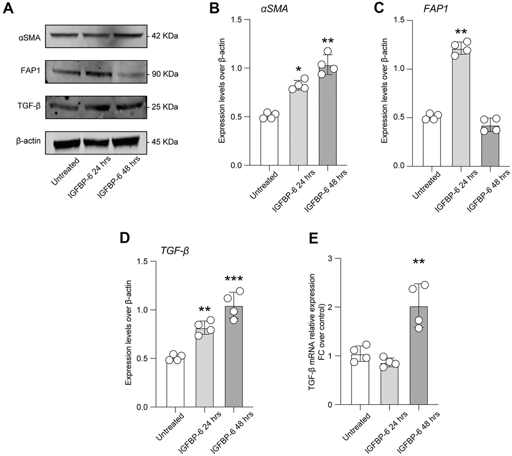 In order to highlight cellular mechanisms involved in BM fibrosis, we moved to study the effects of IGFBP-6 signalling in HS5 cells. We exposed HS5 cells to 200 ng/mL of IGFBP-6 for 24h and 48h and we then analyzed the expression levels of cancer-associated fibroblasts (CAFs) markers. Western blot analysis revealed that 24h post-IGFBP-6 exposition, the expression levels of the CAFs markers α-smooth muscle actin (α-SMA, Figure 2A, 2B), fibroblast activation protein (FAP, Figure 2A, 2C), and TGF-β (Figure 2A, 2D) were significantly increased as compared to control cells (Figure 2A–2D), indicating a CAFs transition of HS5 cells upon IGFBP-6 signalling stimulation. α-SMA and TGF-β levels were significantly upregulated also 48h post-IGFBP-6 exposition (Figure 2A–2D) and qRT-PCR confirmed TGF-β mRNA levels at 48h as compared to control cultures (Figure 2E).