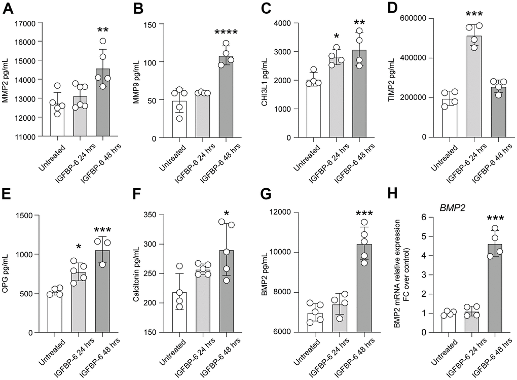 We observed that both matrix metalloproteinase-2 (MMP2) and MMP9 were increased 48h after IGFBP-6 exposition (Figure 3A, 3B), and this was coupled with an increased expression of chitinase 3 like 1 (CHI3L1) after both 24h and 48h post-treatment (Figure 3C). We also observed that TIMP metallopeptidase inhibitor 2 (TIMP2) levels were increased by IGFBP-6 stimulation at 24h, even if our data report near-normal levels at 48h \post-IGFBP-6 exposition (Figure 3D). Also, the levels of TNF receptor superfamily member 11b osteoprotegerin (OPG) and calcitonin were found to increase over time upon IGFBP-6 exposition (Figure 3E, 3F). Finally, bone morphogenetic protein 2 (BMP2) expression was 2-fold increased in IGFBP-6 treated cells as compared to control (Figure 3G) and this was supported by an increased BMP2 mRNA expression (Figure 3H).