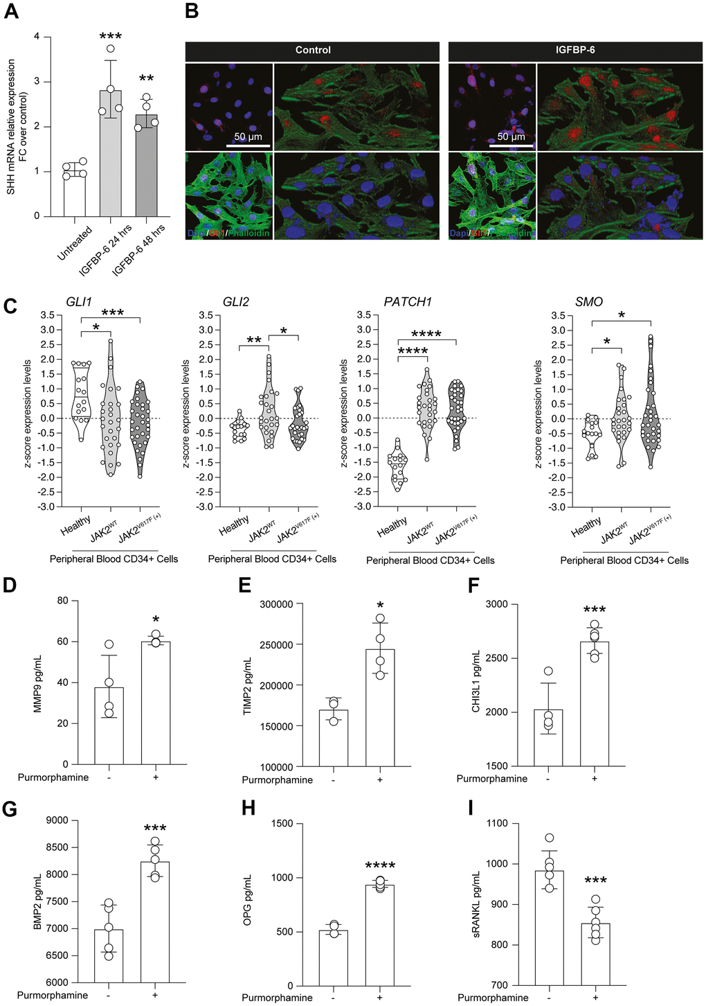 Given the relevance and druggability of the SHH signalling pathway, we analyzed the levels of proliferation and migration mediators found as induced by IGFBP-6, in HS5 cells exposed to the SMO agonist purmorphamine. Intriguingly, we observed an IGFBP-6 superimposable increase of MMP9 (Figure 4D), TIMP (Figure 4E), CHI3L1 (Figure 4F), BMP2 (Figure 4G), and OPG (Figure 4H) upon purmorphamine stimulation, as compared to control levels. Such evidence was coupled with a significant reduction of Soluble RANK Ligand (sRANKL) in purmorphamine-treated HS5 cells (Figure 4I).