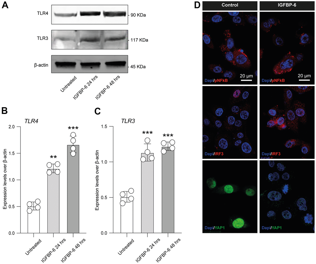 Cells were grown directly on coverslips before immunofluorescence and treated with IGFBP-6 at the final concentration of 200 ng/mL. After washing with PBS, cells were fixed in 4% paraformaldehyde (category no. 1004968350 Sigma-Aldrich, Milan, Italy) for 20min at room temperature. Subsequently, cells were incubated with primary antibody against p – NFkB, IRF3, and YAP1 at 1:200 dilution, overnight at 4° C. After 24h, cells were washed three times in PBS for 5 min and then incubated with TRITC secondary antibody (anti-goat, Santa Cruz Biotechnology, Santa Cruz, CA, USA) (1:200) for 1h at room temperature. The slides were mounted with a medium containing DAPI (4′,6- diamidino-2phenylindole, category no. sc-3598, Santa Cruz Biotechnology, Santa Cruz, CA, USA) to visualize nuclei. The fluorescent images were obtained using a Zeiss Axio Imager Z1 microscope with Apotome 2 system (Zeiss, Milan, Italy). The specificity of immunostaining was verified by excluding incubation with the primary or secondary antibody, as the negative control. Immunoreactivity was evaluated considering the signal-to-noise ratio of immunofluorescence [38].