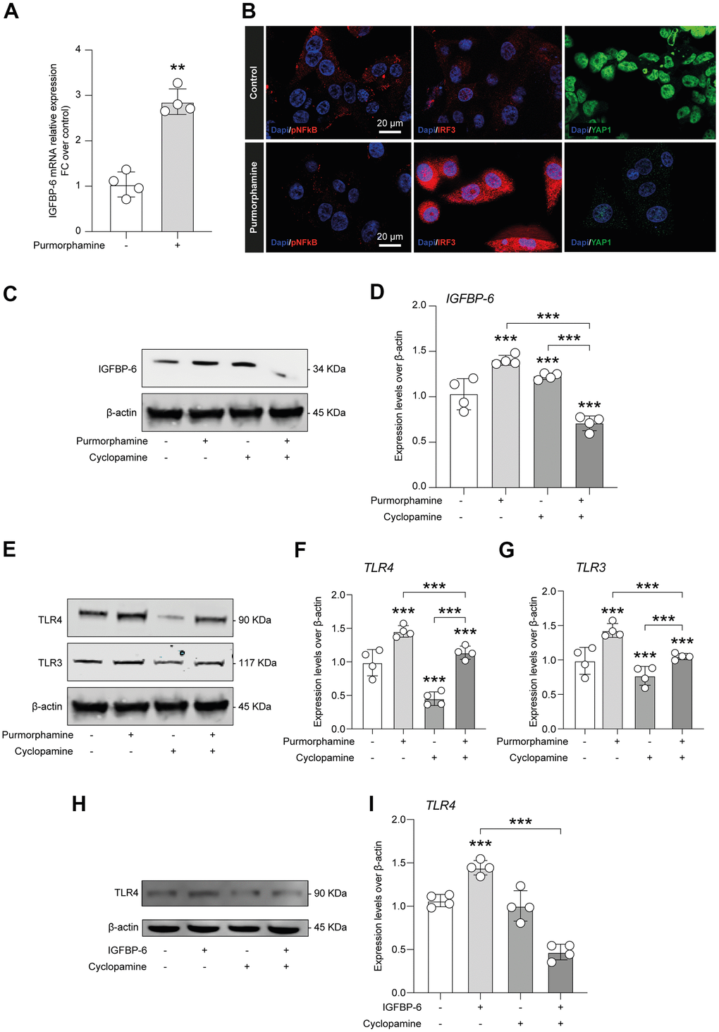 In the effort to link SHH signalling stimulation throughout purmorphamine, IGFBP-6 effects, and TLR4, we first analyzed whether purmorphamine was able to increase IGFBP-6 mRNA levels, confirming a mechanistic link between SMO activation and IGFBP-6 expression levels (Figure 6A). Importantly, we also found that purmorphamine stimulation was able to induce a similar immunofluorescence profile of pNF-kB, IRF3, and YAP1 as compared to HS5 cells exposed to IGFBP-6 (Figure 5D, 6B). Indeed, we found increased IRF3 in purmorphamine stimulated cell cultures and reduced expression of pNF-kB and YAP1 (Figure 6B). We then moved to analyze protein expression levels upon positive (i.e. purmorphamine) and negative (i.e. cyclopamine) modulation of SHH signalling pathway. Evaluating the effects of purmorphamine-induced SMO activation, we found that purmorphamine was able to increase both TLR4 and TLR3 protein expression levels (Figure 6E–6G), and even more that cyclopamine, a SMO antagonist, was able to suppress TLR4 and TLR3 signalling (Figure 6E–6G). Of note, co-treatment with both SMO agonist and antagonist did not affect TLR4 and TLR3 expression levels, as compared to control cell cultures (Figure 6E–6G).