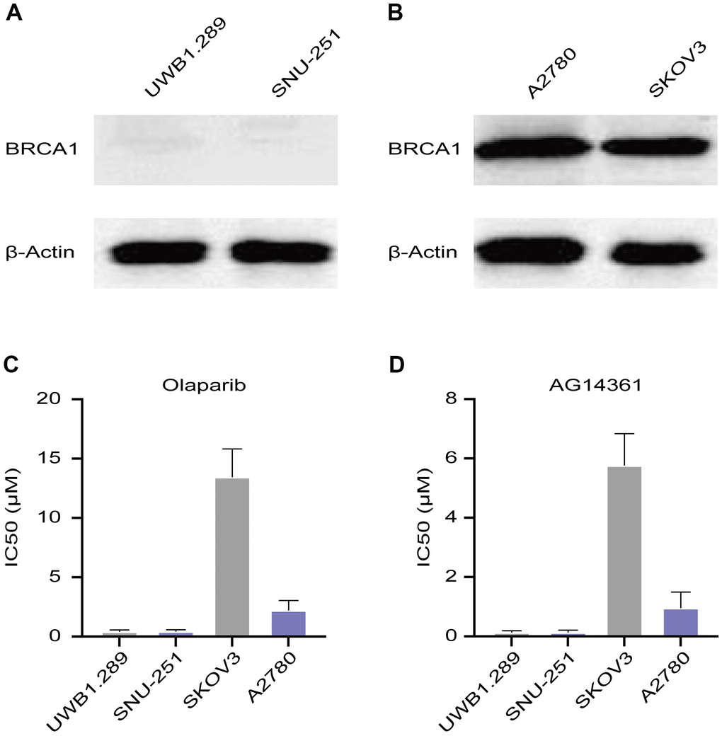 A2780 and SKOV3 cells are wild-type BRCA cancer cells, while UWB1.289 and SNU-251 cells have deleterious BRCA1 mutations. To verify these characteristics, we tested BRCA1 protein levels in these ovarian cancer cell lines. Western blotting assays confirmed that UWB1.289 and SNU-251 cells were BRCA1-mutated cells (Figure 1A). A2780 and SKOV3 cells expressed similar equal amounts of BRCA1 protein (Figure 1B). To test the sensitivity of ovarian cancer cells to PARP inhibitors, we treated these cells with different doses of PARP inhibitors (olaparib and AG14361). UWB1.289 and SNU-251 cells showed greater sensitivity to PARP inhibitors than compared to A2780 and SKOV3 cells, whereas SKOV3 cells showed the lowest sensitivity to both olaparib and AG14361 (Figure 1C, 1D). These results indicated that PARP inhibitor sensitivity is related not only to BRCA1 mutation but also to other latent factors.