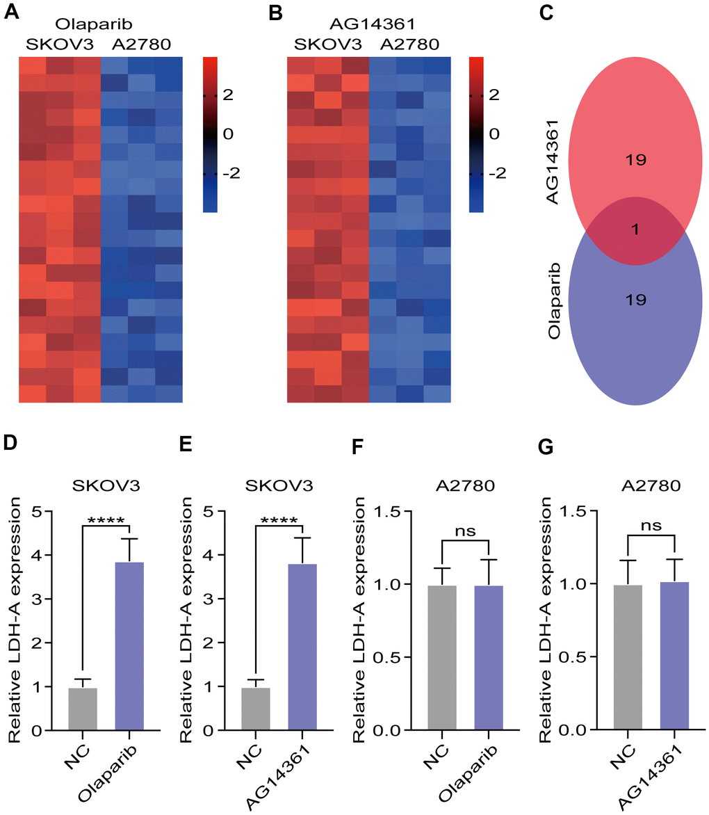 To explore the potential reason for insensitivity to PARP inhibitors, we compared differentially expressed genes in A2780 and SKOV3 cells after olaparib or AG14361 treatment for 24 hours. The heatmap presents the dysregulated genes in the RNA sequencing data (Figure 2A, 2B). The Venn diagram shows that there was only one gene, LDH-A, existed at the intersection of the olaparib-treated group and the AG14361-treated group (Figure 2C). To verify these results, we tested LDH-A levels in A2780 and SKOV3 cells by RT-PCR after olaparib or AG14361 treatment for 24 hours. As shown, PARP inhibitor treatment increased LDH-A levels in SKOV3 cells (Figure 2D, 2E), while LDH-A levels did not significantly change with PARP inhibitors treatment in A2780 (Figure 2F, 2G). These results indicated that PARP inhibitors increased LDH-A levels in SKOV3 cells but not in A2780 cells, suggesting that LDH-A is a potential factor in reducing PARP inhibitor sensitivity.