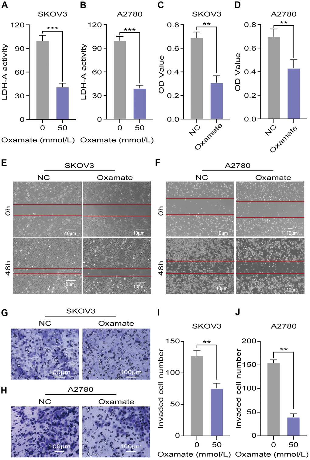 To confirm the efficiency of the specific LDH-A inhibitor, we tested the LDH-A levels in A2780 and SKOV3 cells after oxamate treatment for 24 hours. The results showed that LDH-A levels were significantly decreased in both A2780 and SKOV3 cells (Figure 3A, 3B). To verify the effect of oxamate on ovarian cancer progression, we tested the proliferation, migration, and invasion ability of A2780 and SKOV3 cells. CCK-8 assays showed that oxamate reduced the proliferation rates of both A2780 and SKOV3 cells (Figure 3C, 3D). Regarding migration ability, scratch assays indicated that oxamate markedly reduced the migration ability of A2780 and SKOV3 cells (Figure 3E, 3F). We also tested the invasion ability of the SKOV3 and A2780 cells by Transwell assays. We captured metastatic tumor cells and counted them under a microscope. The results showed that oxamate effectively blocked the invasion ability of A2780 and SKOV3 cells (Figure 3G–3J). These results indicated that the proliferation, migration, and invasion of both A2780 and SKOV3 cells can be inhibited by the specific LDH-A inhibitor oxamate.