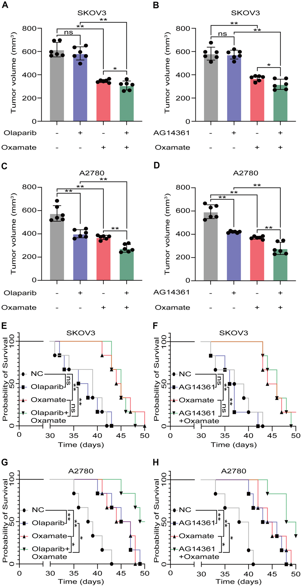 Based on our previous findings, we next aimed to investigate whether a combination treatment including PARP inhibition and LDH-A inhibition showed synergistic effects in vivo. We treated SKOV3 and A2780 cells with oxamate and/or a PARP inhibitor (olaparib or AG14361) respectively and recorded tumor progression. Analysis of the volumes of xenograft tumors showed that the PARP inhibitors had obvious effects on A2780-derived xenograft tumors, but the effects on SKOV3-derived xenograft tumors were not significant. For the combination of oxamate and PARP inhibitor treatment, there was a synergistic anticancer effect on both SKOV3-derived xenograft tumors and A2780-derived xenograft tumors (Figure 4A–4D). The prognoses of xenograft tumor models were recorded, and the results showed that although the PARP inhibitors (olaparib and AG14361) did not significantly prolong the survival times of the animals with SKOV3-derived xenograft tumors, oxamate compensated for this shortcoming (Figure 4E, 4F). For the animals with A2780-derived xenograft tumors, combination treatment achieved the best effect (Figure 4G, 4H). These results indicated that even when the effects of PARP inhibitors are not ideal, the combined application of oxamate can effectively inhibit tumor progression and improve tumor prognosis.