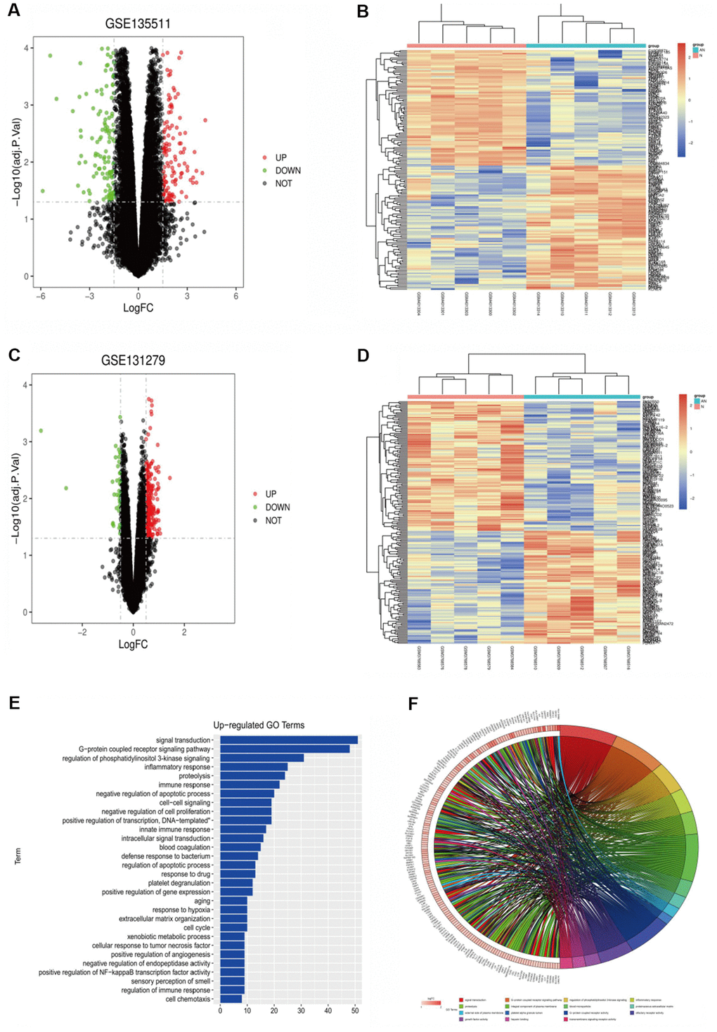 Go (Gene Ontology) enrichment analysis and KEGG (Kyoto Encyclopedia of Genes and Genomes) enrichment analysis were performed on the common differentially expressed Genes obtained from GSE135511 and GSE131279 datasets. David online database tool (https://david.ncifcrf.gov) was used to analyze the relative differentially expressed genes at the three levels of biological process, cell component and molecular function, so as to integrate GO terms and create a biological process network of differentially expressed genes. GOPlot and ggplot2 package were used to plot the GO pathway and KEGG pathway enrichment analysis of differentially expressed genes in R language environment.