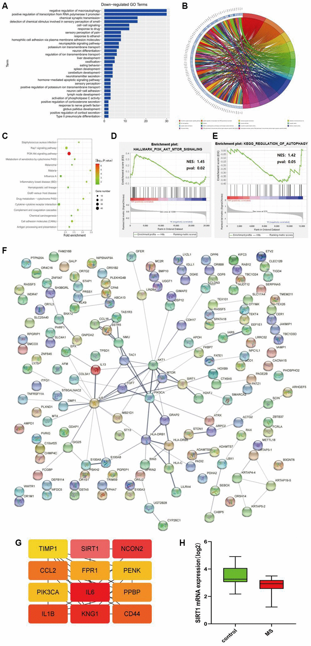 MS is a chronic inflammatory autoimmune disease of the central nervous system mediated by T cells. Its main pathological feature is inflammatory demyelinating changes of the central nervous system [13]. This disease tends to occur in young and middle-aged people [14], and is mostly seen in women. At present, relevant researchers generally accept that the pathogenesis of MS is an autoimmune response mediated by T cells, which mainly targets the myelin antigens of the central nervous system [15]. Because its etiology and pathogenesis are not very clear, it cannot cure its disease fundamentally. Among them, EAE animal model is internationally recognized as the classic animal model of MS, which is widely used in basic research of MS [16]. Thymus is the major central immune organ and responsible for T cell development and maturation, T cells recognize our own antigens in thymic epithelial cells (TECs), which result in the clonal deletion or clonal non-response of autoreactive T cells and lead to autoimmune tolerance [3, 4]. Therefore, in this study, EAE mice were used as the animal experimental model of MS to explore the effect of NAD+ on the thymus autophagy mechanism of EAE mice through SIRT1. Through the bioinformatics, KEGG enrichment analysis manifested that the PI3K-AKT-mTOR was one significant pathway in the occurrence and development of multiple sclerosis. In addition, GSEA gene enrichment analysis also demonstrated the above results. Furthermore, through the cytohubba SIRT1 was identified as the hub gene of the multiple sclerosis.